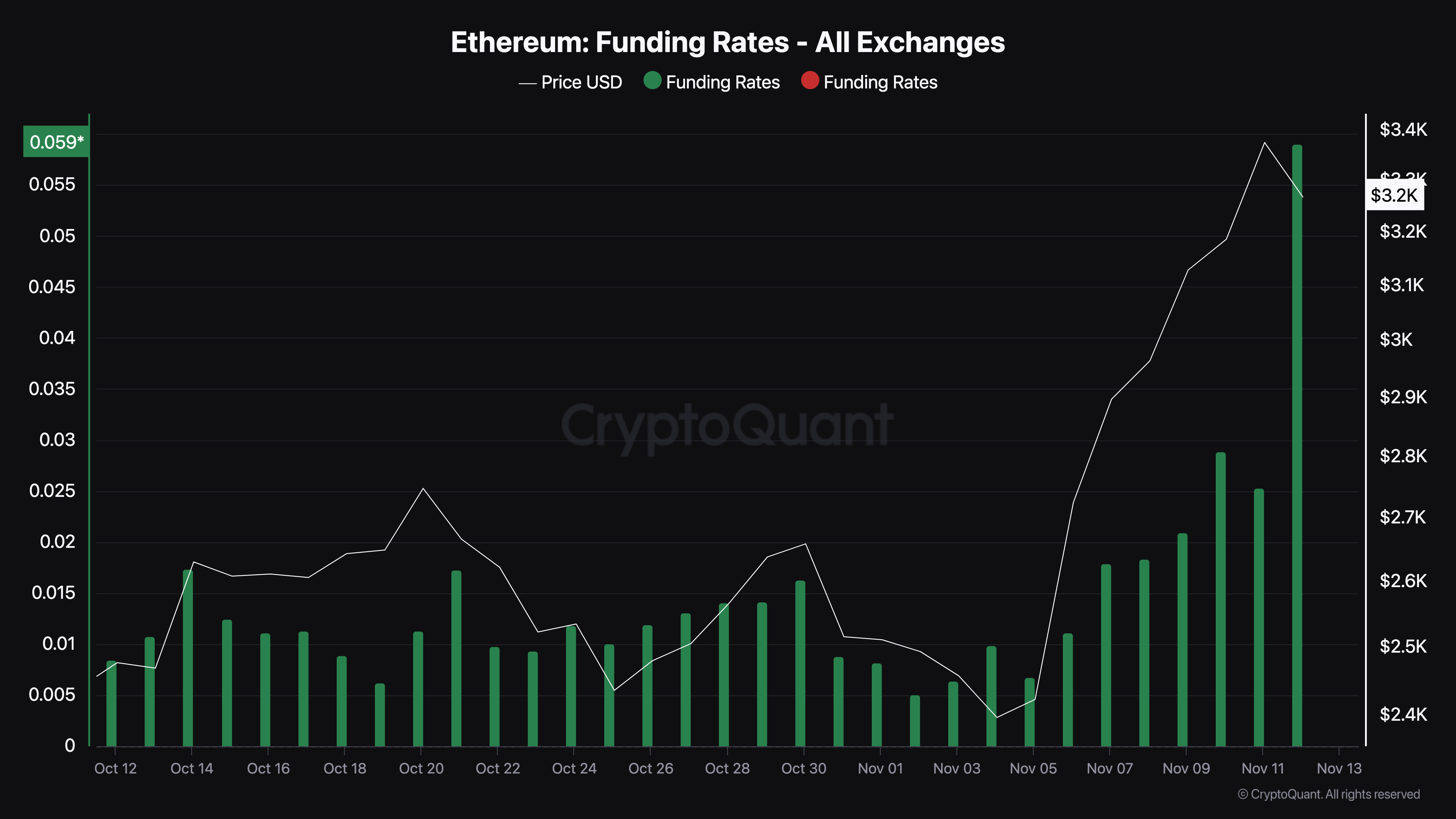 Piyasadaki diğer kripto paralar gibi, ETH’nin fiyatı da son zamanlarda çift haneli artış kaydetti. Bugün altcoin, 3.445 dolara kadar yükseldi ancak daha sonra 3.256 dolara düştü. Artışın ardından Ethereum’un fonlama oranı sekiz ayın en yüksek seviyesine çıktı.