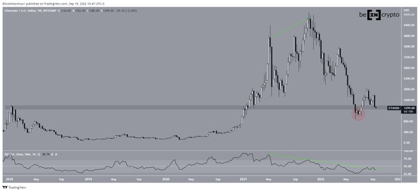 ETH, Kasım 2021’de 4.868 dolara ulaşarak rekor kırdıktan sonra düşmeye başladı. Haziran 2022’de 880 dolara kadar gerileme yaşandı. Bu da 1.300 dolar destek bölgesinden kırılıma sebep oldu (kırmızı daire).