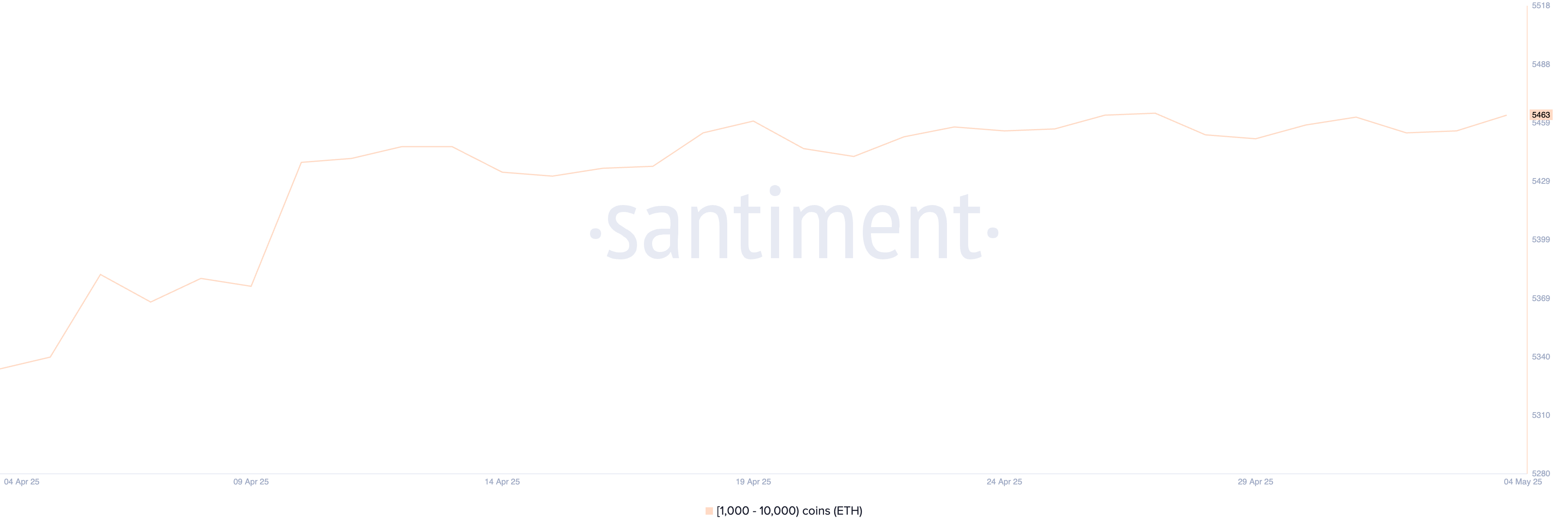Daha geniş resme ek olarak, Ethereum balinalarının 1.000 ile 10.000 ETH arasında tutan adresler, sayısı şu anda 5.463’te bulunuyor.