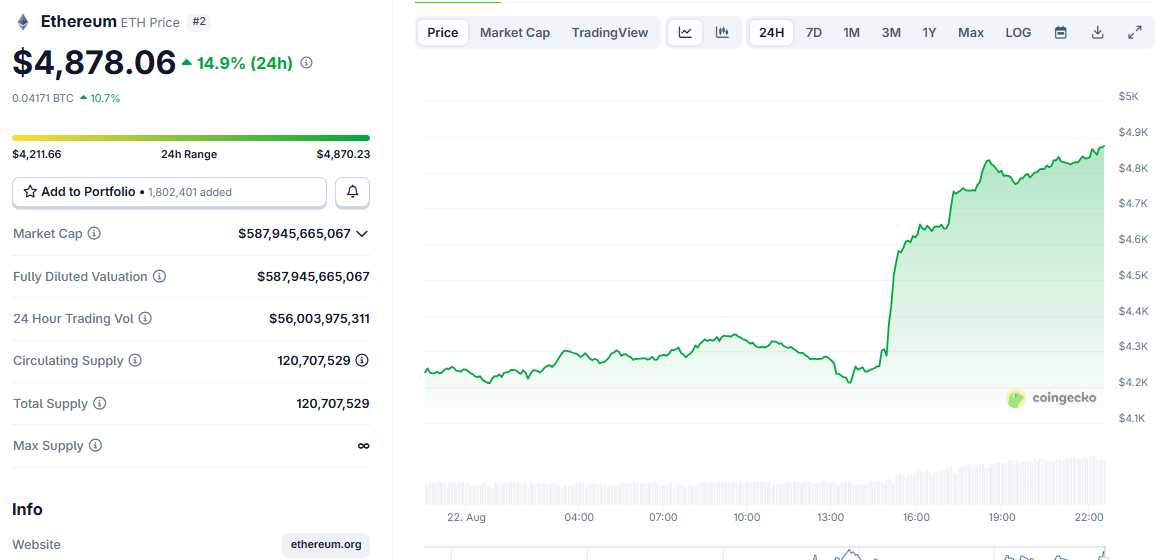 Ethereum’un fiyatı son zamanlarda dalgalı bir seyir izliyor. Bir yanda yoğun kurumsal girişler, diğer yanda ise büyük trader likidasyonları arasında denge kuruyor. Ancak bugün, Jerome Powell’ın Jackson Hole konuşmasının ardından token önemli bir fiyat artışı yaşadı. Bu, Ethereum için büyük bir destek oldu ve yeni bir tüm zamanların en yüksek seviyesine ulaştı:
