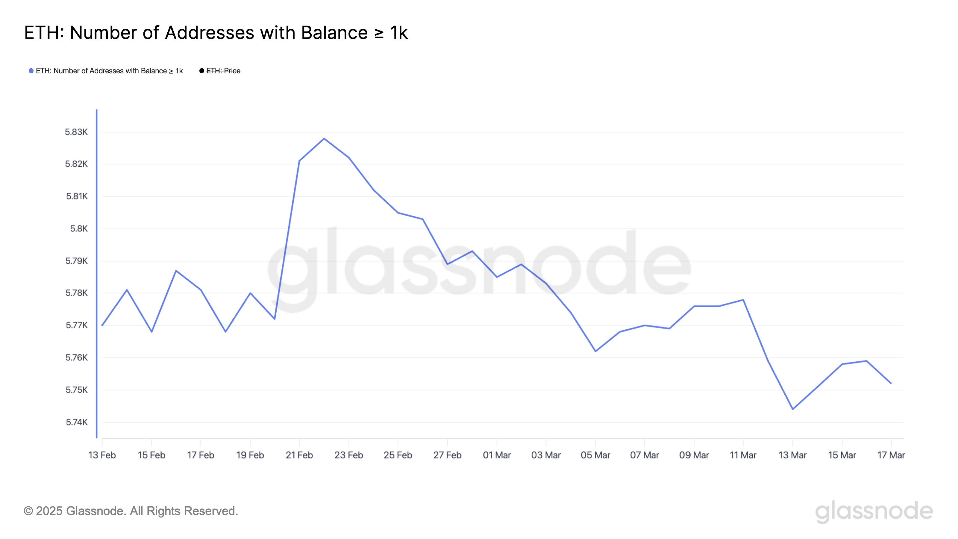 En az 1.000 ETH tutan cüzdanlar olan Ethereum balinalarının sayısı, 22 Şubat’ta 5.828 adresle zirve yaptıktan sonra istikrarlı bir şekilde azaldı.