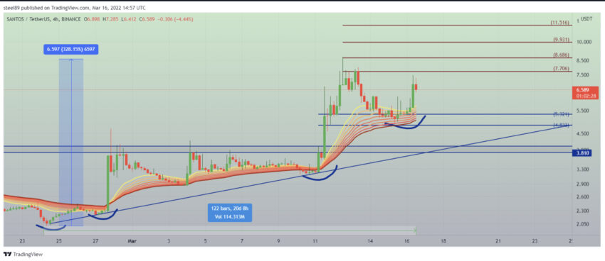 Pek çok diğer fan token gibi SANTOS’da 11 Mart günü yukarı yönlü rallisini başlattı. 13 Mart gününe gelindiğinde Santos FC Fan Token %170 artış göstermişti. Popüler fan tokenin 27 Şubat’tan bu yana daha yüksek dipler ve daha yüksek zirveler oluşturduğu görülüyor. Deneyimli analist atscrypto, SANTOS’un yükselişine devam edebileceğini ifade ediyor: