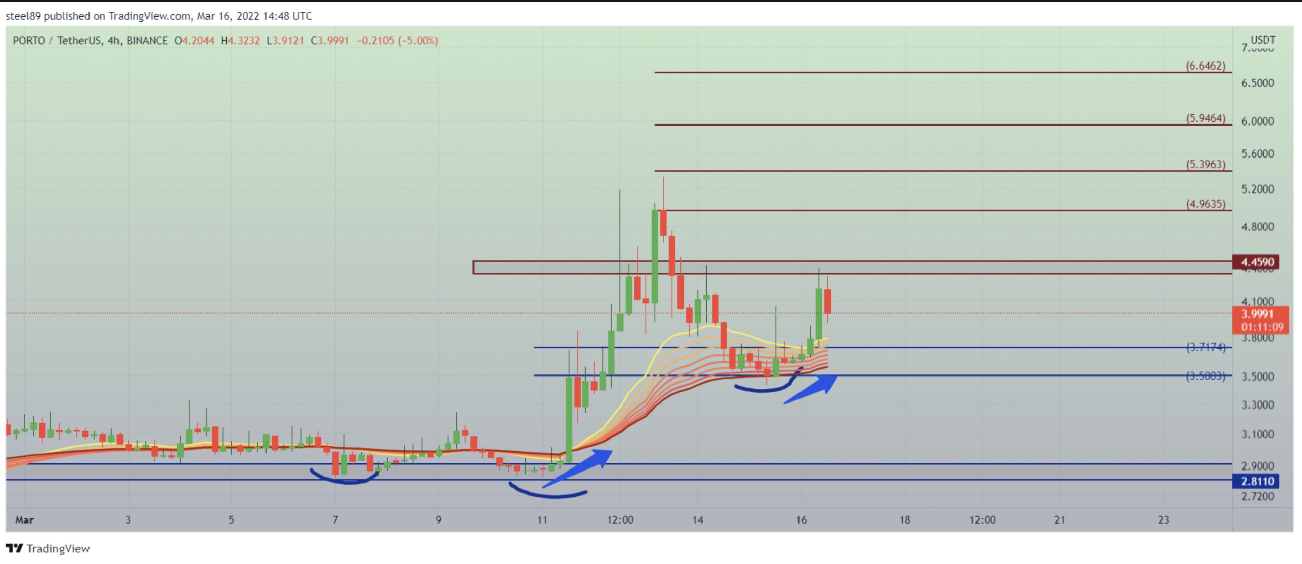 “PORTO, 2,80 dolar seviyesinden güzel bir sıçramayla 5,30 dolar seviyelerine kadar yükseliş yaptı. Şimdi 3,5 dolar desteğinden tekrar yukarı bir hareket başlatarak 4,5 dolar direncini kırmayı deniyor.”