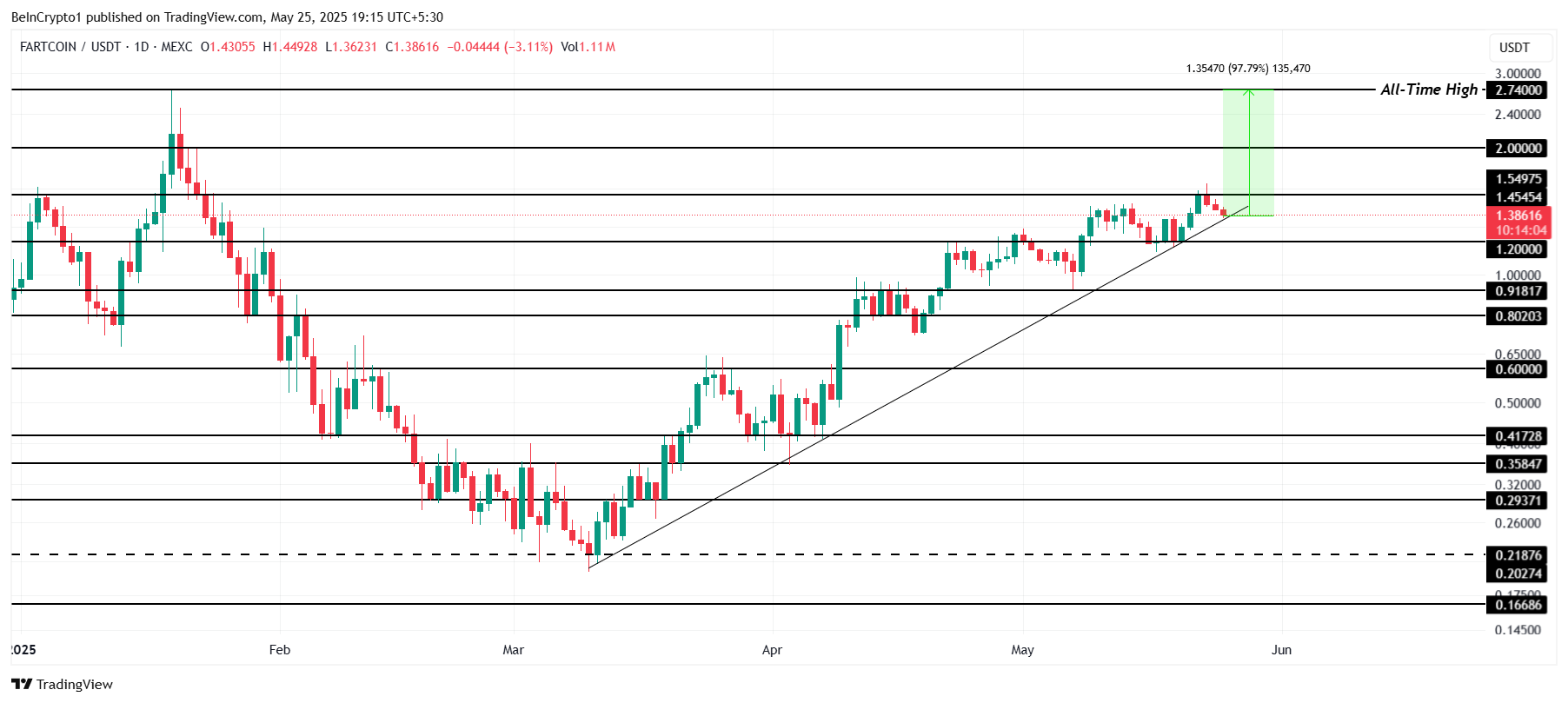 FARTCOIN şu anda 1,38 Dolar’dan işlem görüyor ve bu, meme coin’in ocak ve şubat aylarındaki kayıplarının çoğunu geri kazanmasına yardımcı olan 3 aylık bir yükseliş trendini işaret ediyor.