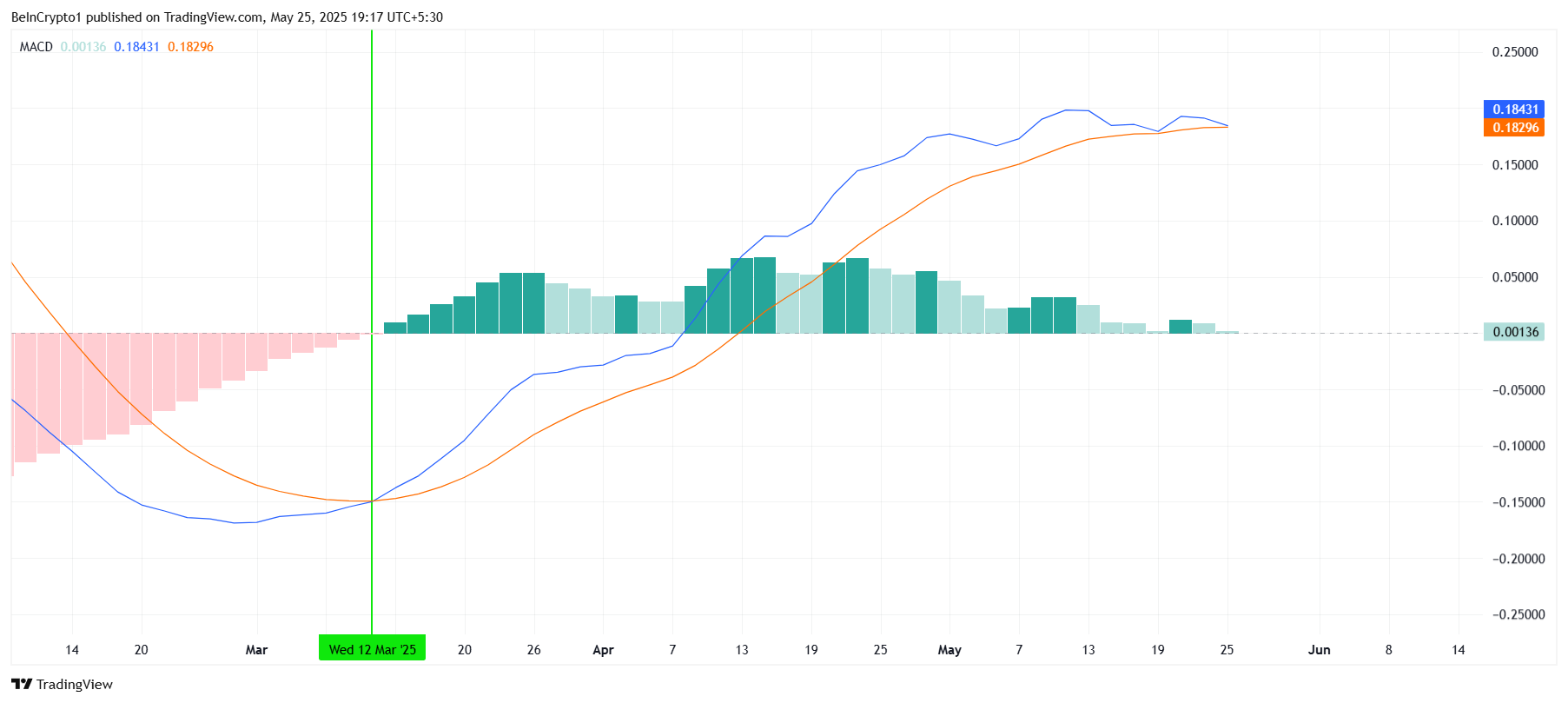 Hareketli Ortalama Yakınsama Iraksama (MACD) göstergesi, FARTCOIN’in son rallisini besleyen yükseliş ivmesinin yakında tükenebileceğini işaret ediyor.
