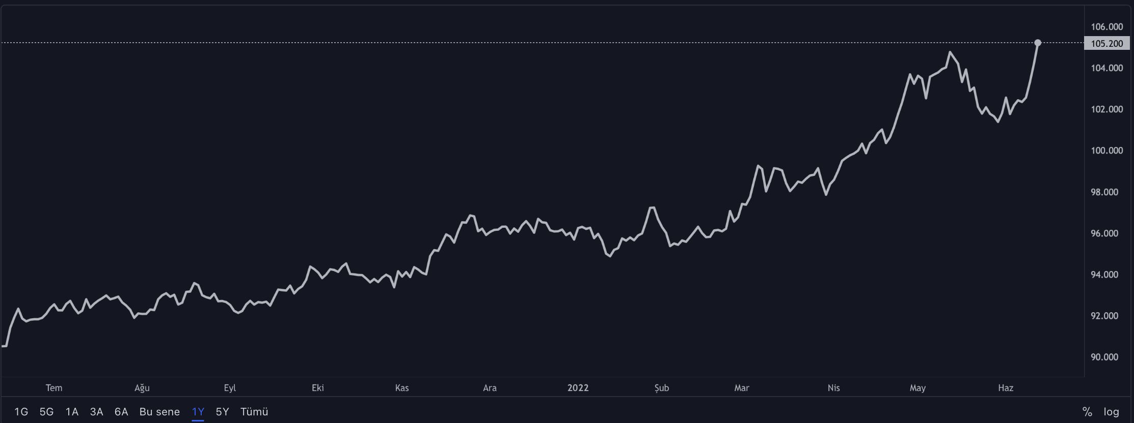 Uzun vadede DXY endeksinin düşüşe geçmesi genellikle Bitcoin fiyatını pozitif etkiliyor. Bu sebeple kripto para piyasaları için doların yönü önem arz ediyor. Şu an FED toplantısına birkaç gün kaldı ve DXY önemli bir uzun vadeli direnç seviyesine yaklaşıyor. ABD Dolar Endeksi, son haftalarda geri çekilme yaşadı. Ancak endeks şimdi yeniden yükselişe geçerek mayıs ayında görülen 105’in en yüksek seviyelerini hedefliyor.