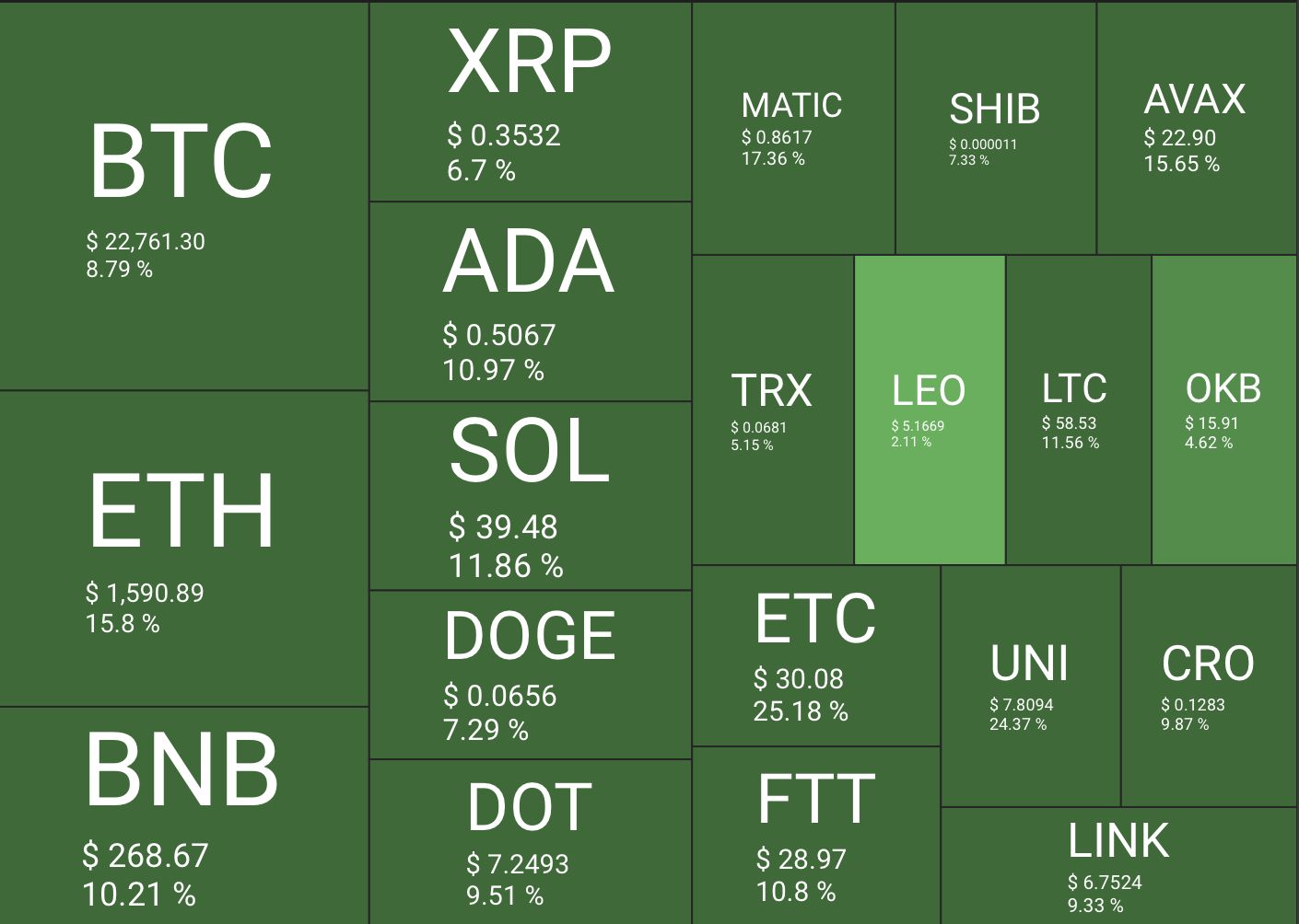 Jerome Powell’ın açıklamlarının öngörü sağlaması ve FED’in faiz kararının beklentilere uygun olması yatırımcı tarafından pozitif okundu. FOMC karar metnini ve Powell’ın açıklamalarını takip eden 1 saat içerisinde Bitcoin fiyatının 23.100 dolara kadar yükseldiği görüldü. Lider kripto para biriminde görülen yükselişe paralel olarak altcoin piyasalarının da yeşile büründüğü görülüyor.