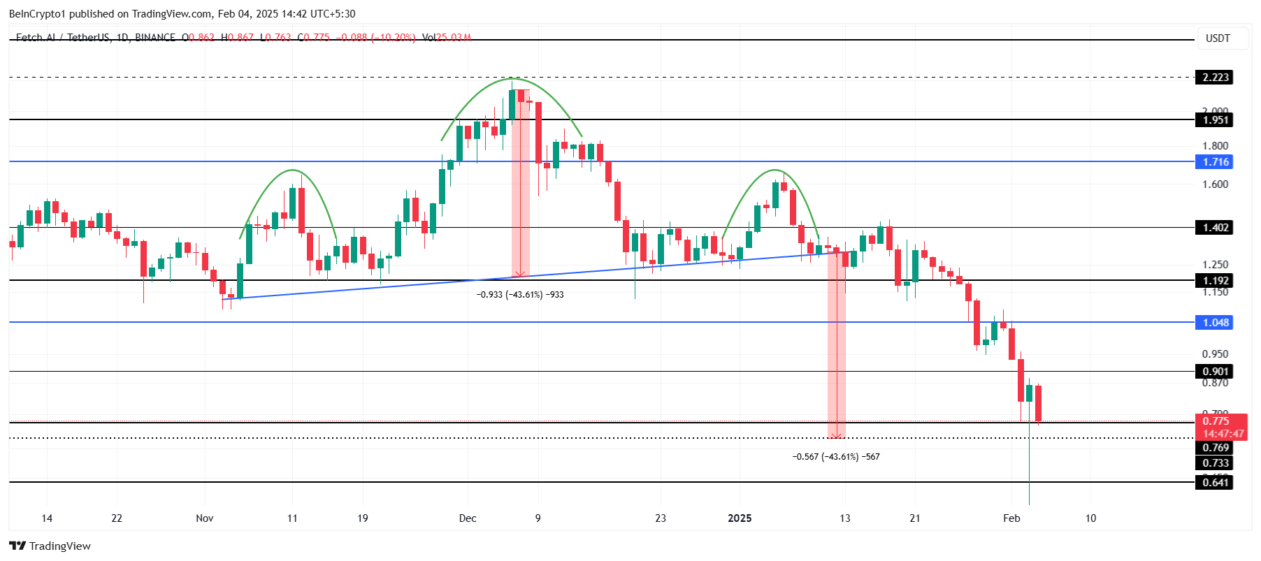 FET’in fiyatı 1,19 Dolar’lık önemli destek seviyesini kırarak yazı yazıldığı sırada 0,77 Dolar’a düştü. Bu düşüş, 0,73 Dolar’a %43,6’lık bir düşüşü öngören baş ve omuz formasyonunun geçerliliğini doğruluyor. Piyasa, beklenildiği gibi keskin bir düzeltme yaşıyor ve bu da önemli bir geri çekilmeye yol açıyor.