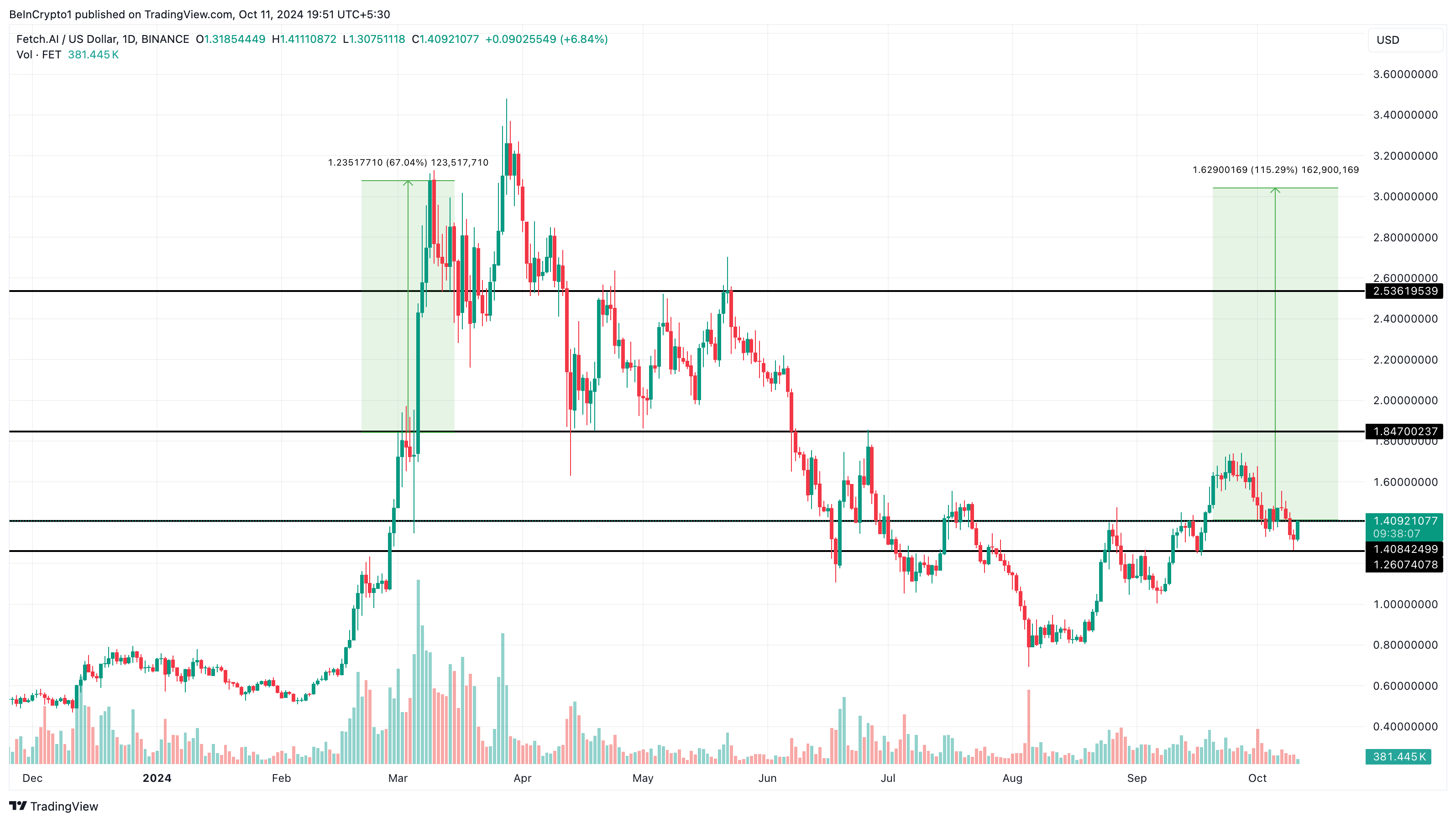 Teknik bir perspektiften, FET’in fiyatı 1,26 dolarlık desteğinden sekerek 1,40 dolara yeniden test etti. İlerleyen süreçte, altcoin 1,85 dolarlık dirençle karşılaşabilir. Ancak, tarihsel veriler bu seviyenin fiyatı yüksek tutmak için hayati olduğunu gösteriyor.