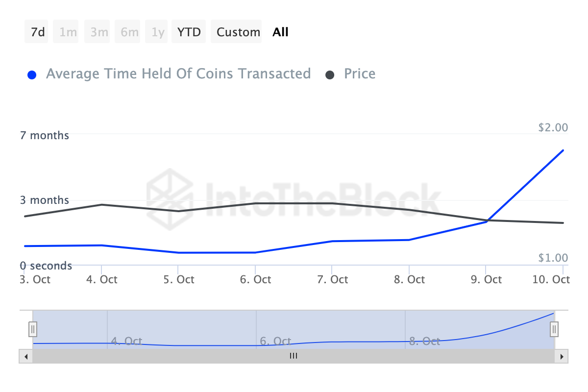 Buna rağmen, Coin Tutma Süresi, sahiplerin satış yapmaktan kaçındığını gösteriyor. Coin Tutma Süresi, bir kripto paranın satılmadan ne kadar süre tutulduğunu gösterir. Arttığında, satış baskısı azalır.
