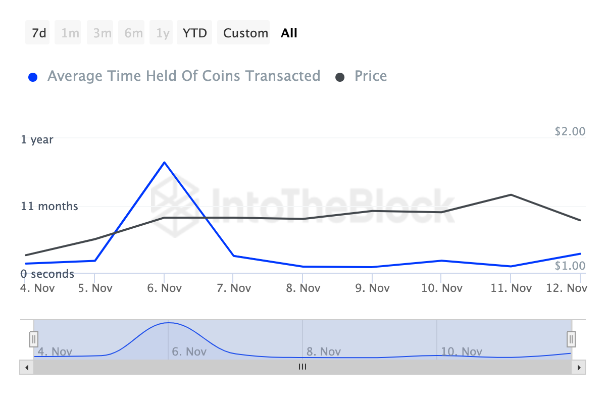 FET’in fiyatının daha da düşebileceğini öne süren önemli bir gösterge, Coin Tutma Süresi’dir. Coin Tutma Süresi, sahiplerin bir kripto parayı satmadan veya işlem yapmadan tuttuğu süredir.