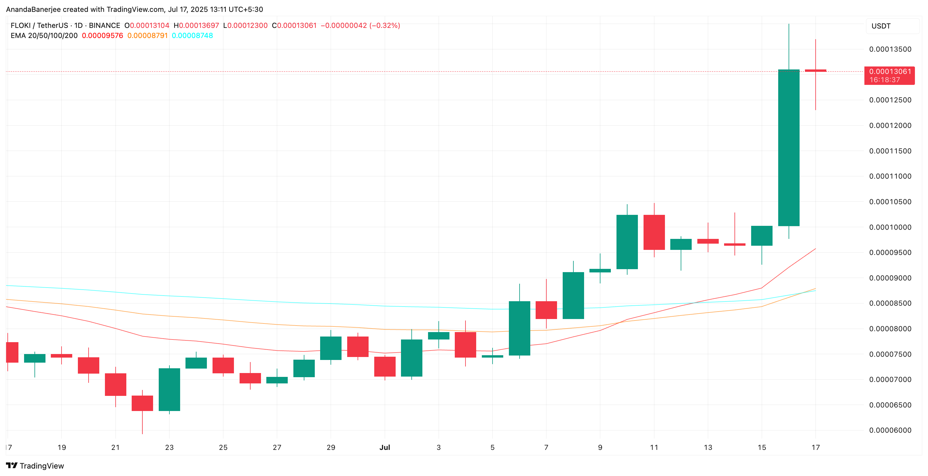 FLOKI’nin fiyat hareketi 10 Temmuz civarında, 20 günlük EMA (üstel hareketli ortalama) 50 günlük EMA’nın üzerine çıktığında hız kazanmaya başladı. İki gün sonra, 20 günlük EMA da 100 günlük EMA’nın üzerine çıktı ve 16 Temmuz itibarıyla 50 günlük EMA, 100 günlük EMA’nın üzerine çıkarak nadir bir Üçlü EMA Boğa Kesişimini doğruladı.