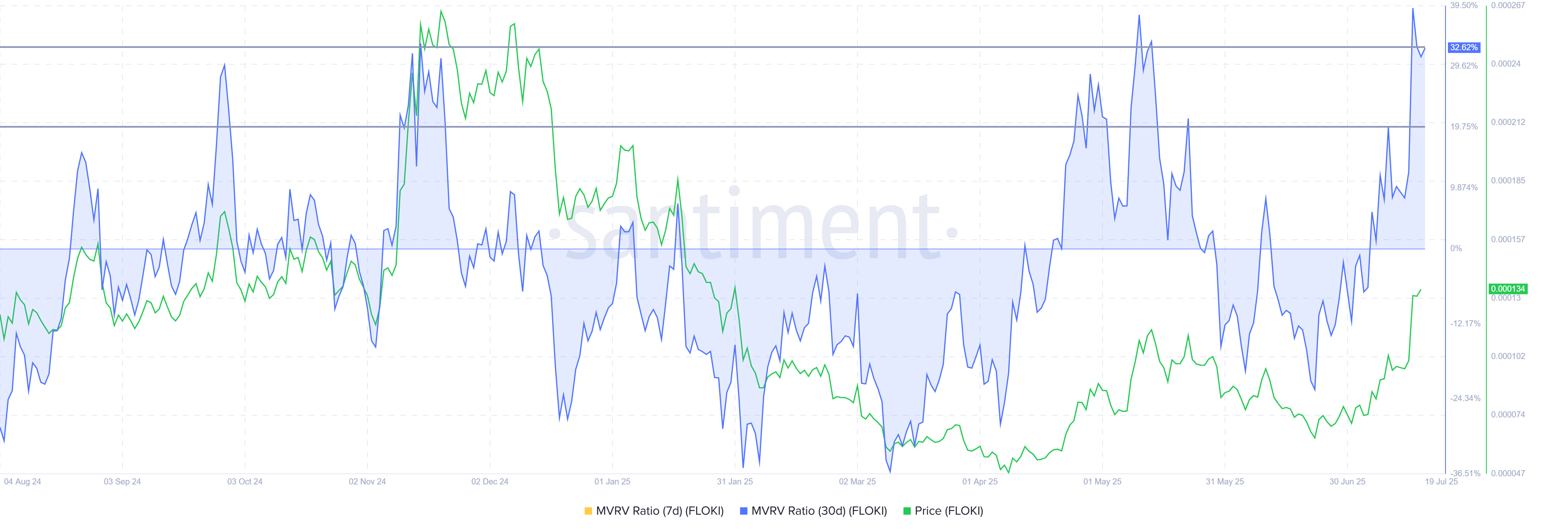 FLOKI’nin son kazançlarının arkasındaki daha geniş makro momentum karışık. MVRV (Piyasa Değeri / Gerçekleşen Değer) Oranı şu anda %32,62 seviyesinde ve bu, geçen ay FLOKI satın alan yatırımcıların %32 kar elde ettiğini gösteriyor.