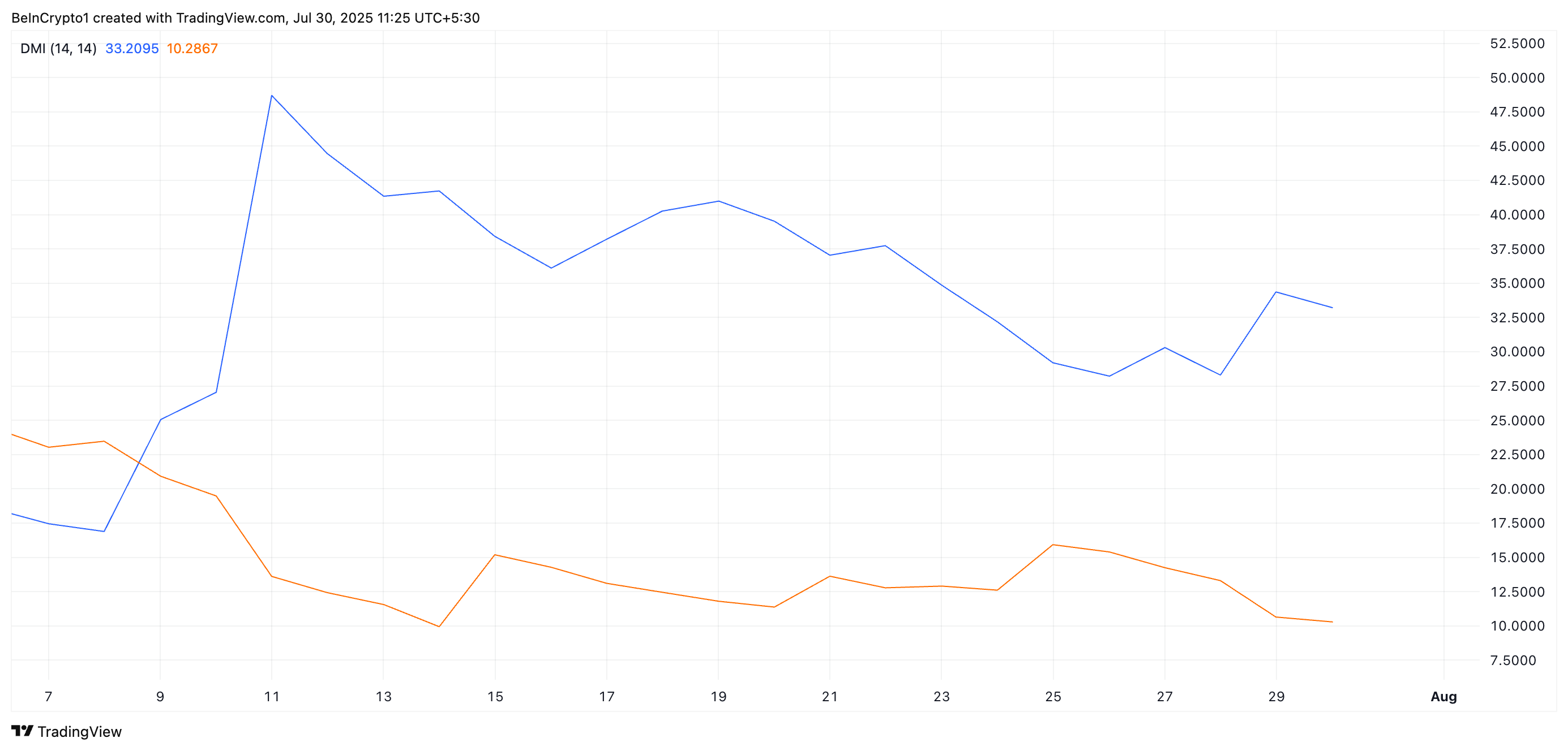 FORM/USD bir günlük grafiğinden alınan veriler, token’ın pozitif yönlü endeksinin (mavi; +DI) 9 Temmuz’da negatif yönlü endeksin (turuncu; -DI) üzerine çıktığını gösteriyor. Bu durum, alıcıların FORM spot piyasalarına yeniden giriş yaptığını işaret ediyor. O tarihten bu yana altcoin’in değeri %30 arttı.