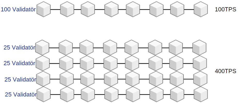 DoğanChain isimli 100 validatörle çalışan ve saniyede 100 işlem yapan bir blok zincir olduğunu varsayalım. DoğanChain’i eğer 4 parçaya böler ve her bir parçasına ayrı ayrı 25 validatör atarsak zincirimiz saniyede 400 işlem yapabilmeye başlar, bu haline de DoğanChain 2.0 diyelim. DoğanChain, yavaş ve pahalıydı ama daha güvenliydi. DoğanChain 2.0’da ise güvenlik biraz daha sorunlu, neden mi?