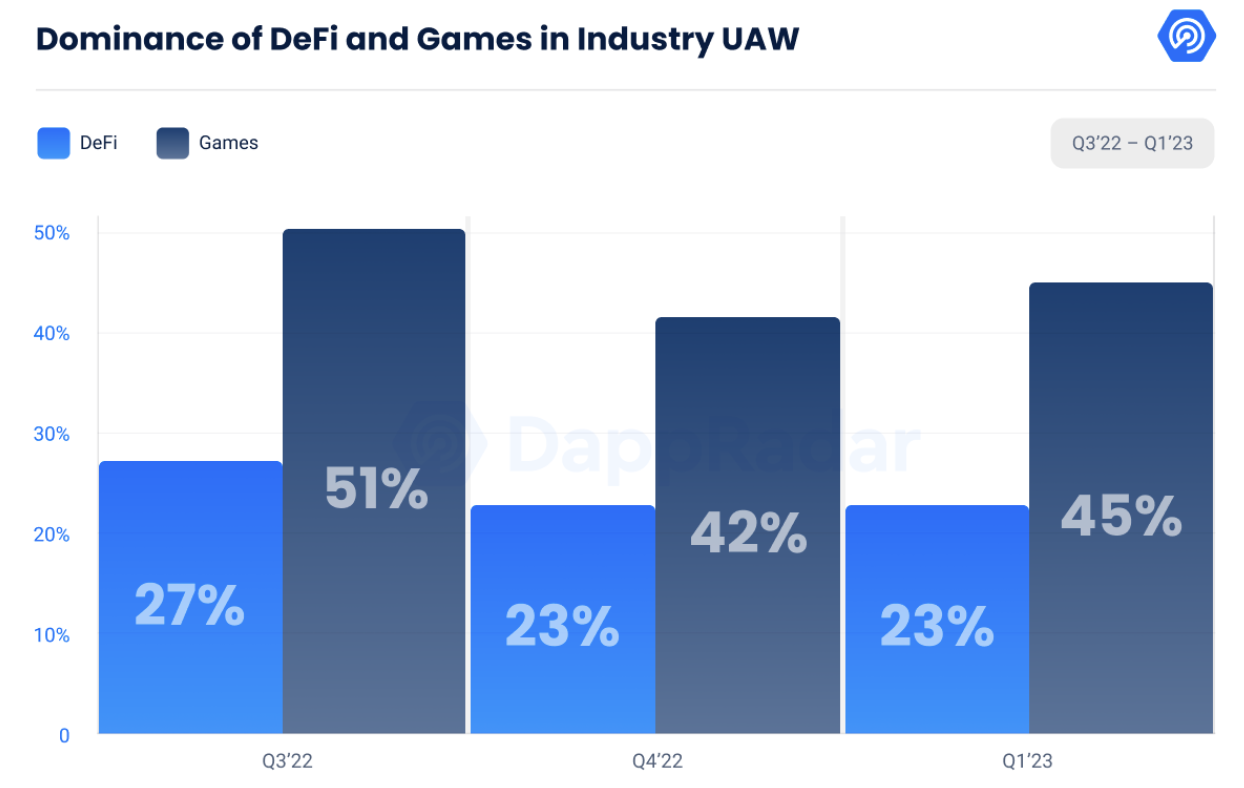 DappRadar ve Blockchain Games Alliance’ın raporu, dikkat çeken On-chain cüzdan aktiviteleri de sunuyor. Verilere göre mart ayında, blockchain oyunları toplam blockchain işlemlerinin %44’ünü oluşturdu. Çeyrek bazında gelen AUW verileri ise Gaming Web3 projelerinin DeFi’ye fark attığını gösterdi.