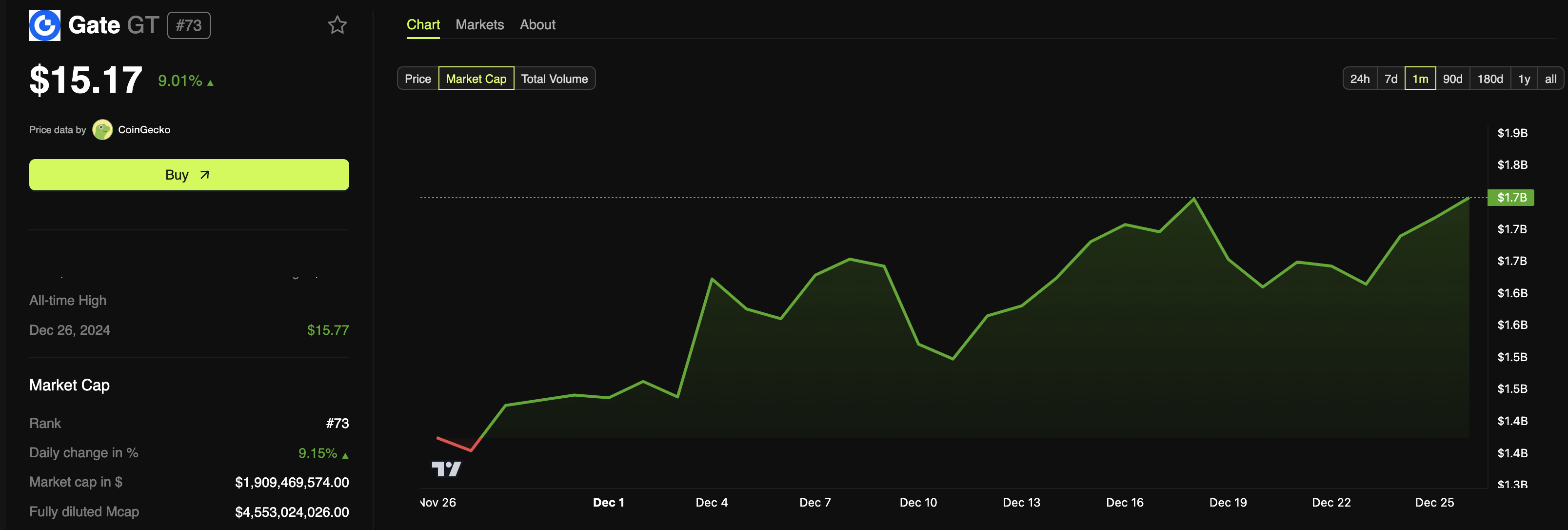 Bu fiyat artışının ardından, Gate’in Piyasa Değeri 2 milyar dolara ulaşmanın eşiğinde. Piyasa değeri, fiyat ve dolaşımdaki arzın çarpımıdır. Dolayısıyla, %10’luk fiyat artışı piyasa değeri büyümesinde büyük rol oynadı.