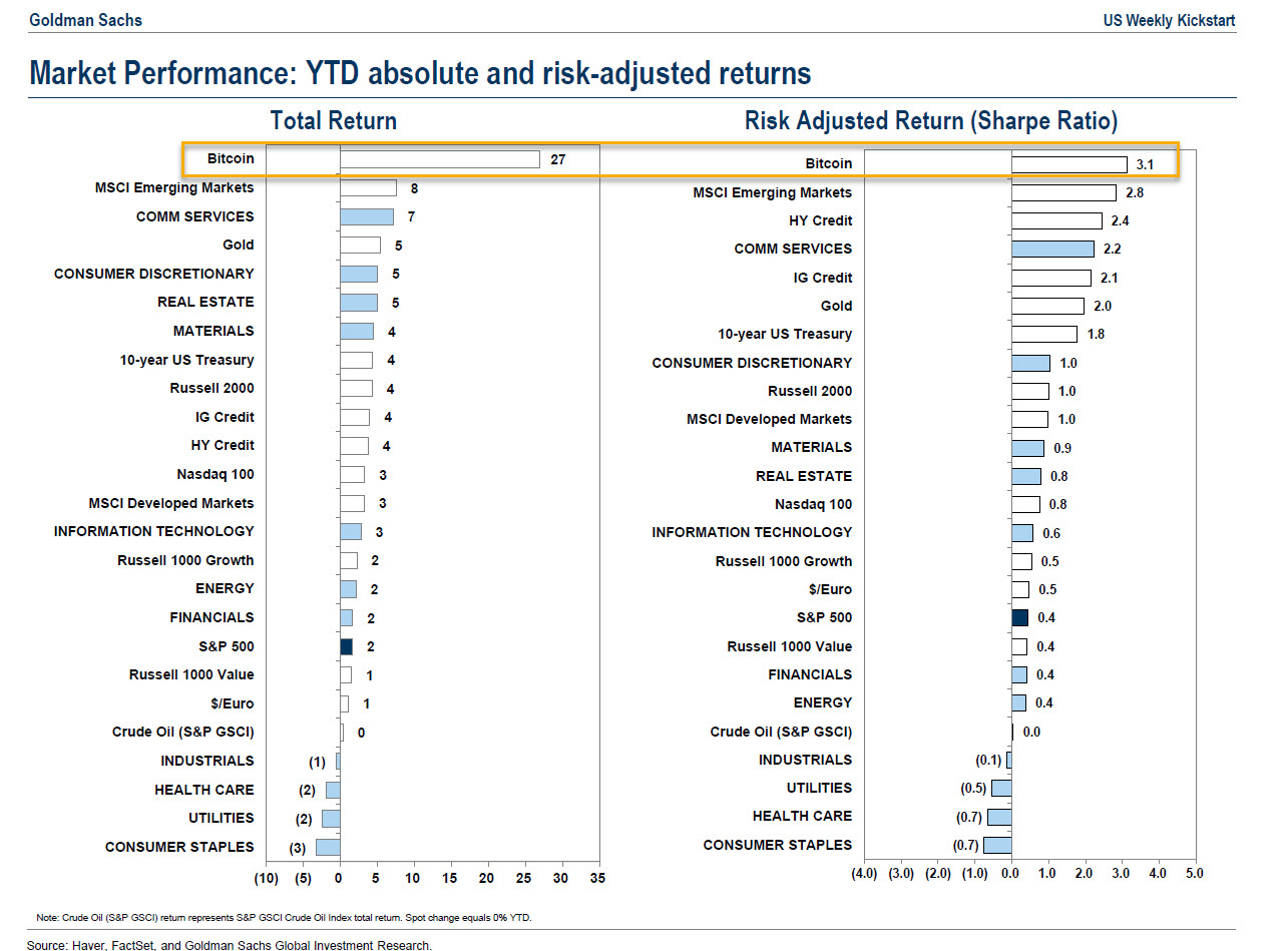 ABD merkezli bankacılık kuruluşu Goldman Sachs son raporunda bu yükselişe dikkat çekti. Banka tarafından paylaşılan grafikte, Bitcoin’in diğer tüm yatırım araçlarından daha iyi performans gösterdiğine vurgu yapıldı.