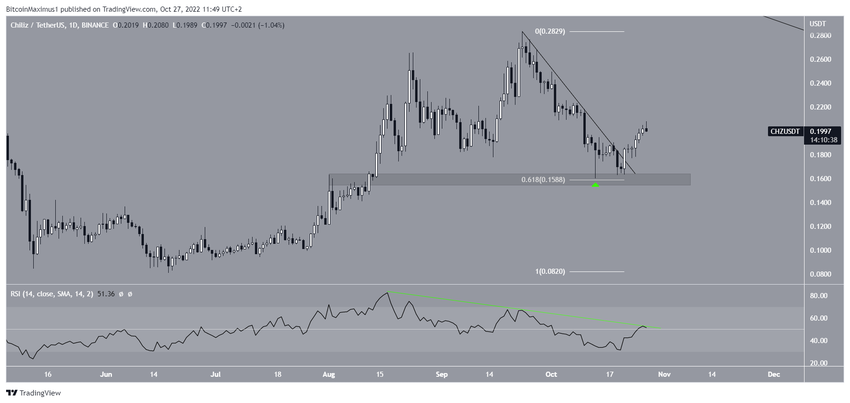 CHZ, 13 Ekim’de aşağı sarkan uzun fitil oluşturup 0,16 dolar destek bölgesini onayladıktan sonra yükselişe geçti. Bu bölge, hem 0.618 Fib düzeltme destek seviyesi hem de yatay destek bölgesi olduğu için önemliydi.