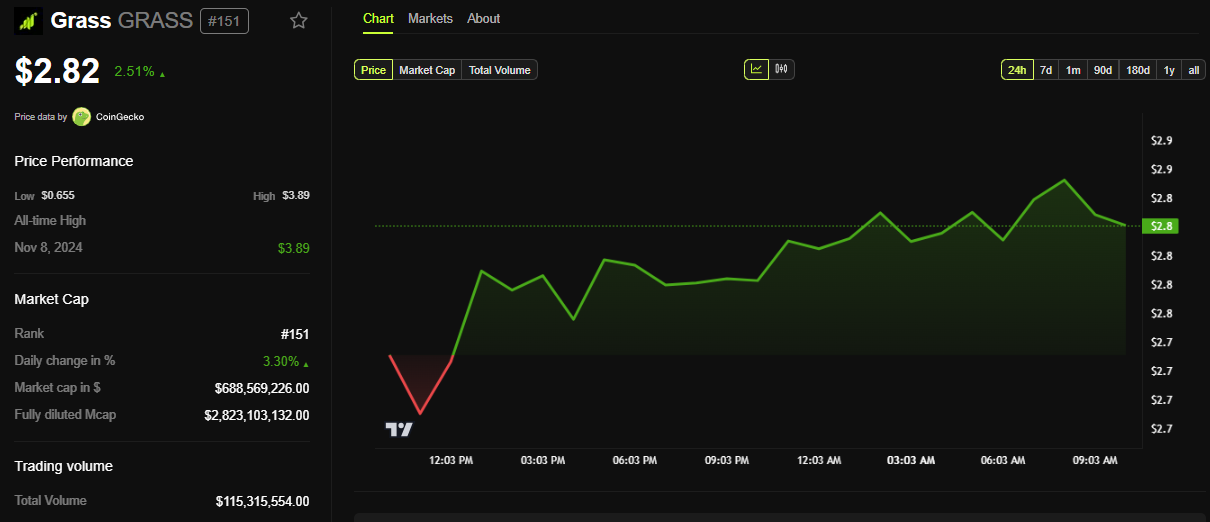 2025 roadmap’inin haberine rağmen, Grass ağının güç sağlayan token’ı GRASS, sadece %2,5’lik mütevazı bir artış gösterdi. BeInCrypto verilerine göre, bu yazı yazıldığı sırada 2,82 Dolar’dan işlem görüyordu.