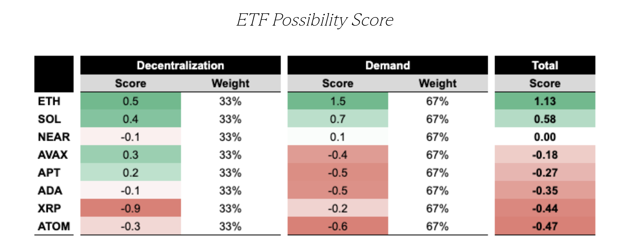 Merkeziyetsizlik ve talep puanını göz önünde bulundurarak, GSR bir metrik hesapladı – ETF olasılığı skoru. Ethereum (ETH) en yüksek ETF olasılığı skoruna sahip, onu Solana ve NEAR Protocol (NEAR) izliyor.