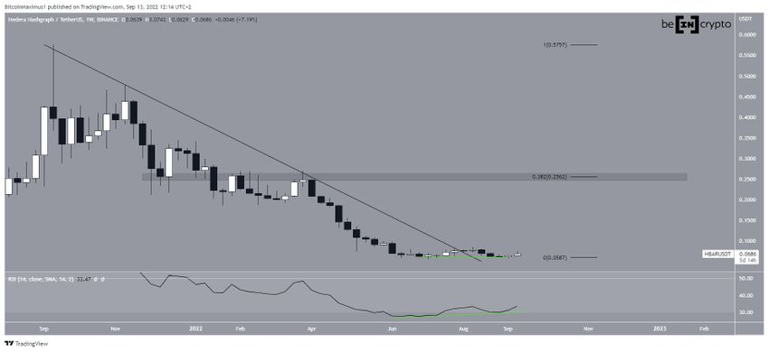 HBAR Coin fiyatı, Eylül 2021’de 0,571 dolar ile rekor kırdıktan sonra düşüşe geçti. Aşağı yönlü hareket alçalan direnç çizgisinin altında gerçekleşti ve şu ana kadar görülen en düşük seviye, Haziran 2022’de kaydedilen 0,055 dolar oldu.