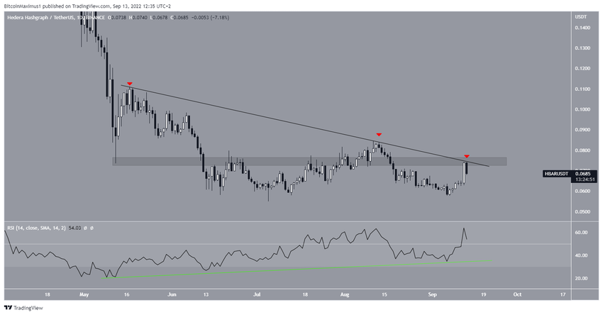 Hedera Hashgraph (HBAR), uzun vadeli yükseliş formasyonu oluşturdu ancak bu formasyon, kısa vadeli dirençten çıkış gerçekleşmediği için henüz onay almadı.