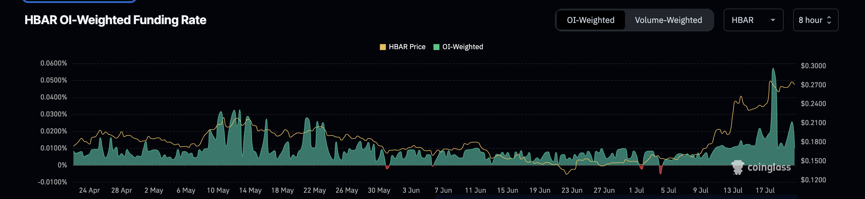 HBAR için açık pozisyon ağırlıklı fonlama oranı, 18 Temmuz’da %0,057’ye ulaşarak aylardır en yüksek seviyesine çıktı. 21 Temmuz itibarıyla hala yüksek olan %0,01 seviyesinde bulunuyor, bu da uzun pozisyonların hakimiyetini sürdürdüğünü gösteriyor.