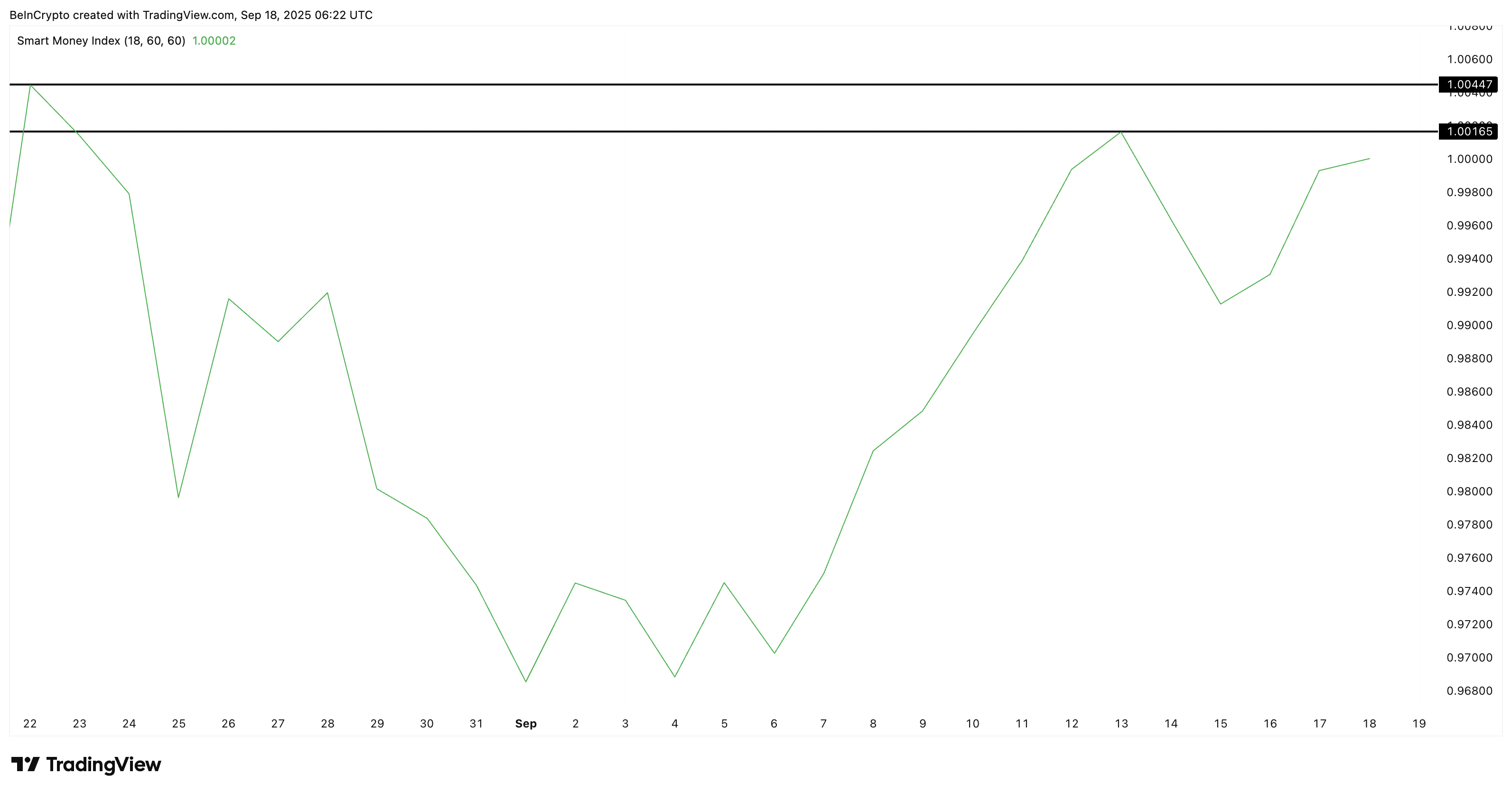Smart Money Index (SMI) farklı bir açı sunuyor. SMI, kısa vadeli sıçramalar arayan hızlı trader’ları takip eder. 1,00 seviyesine geri tırmanmış olsa da, daha güçlü katılımı doğrulayacak olan 1,004 seviyesini henüz geçmedi.