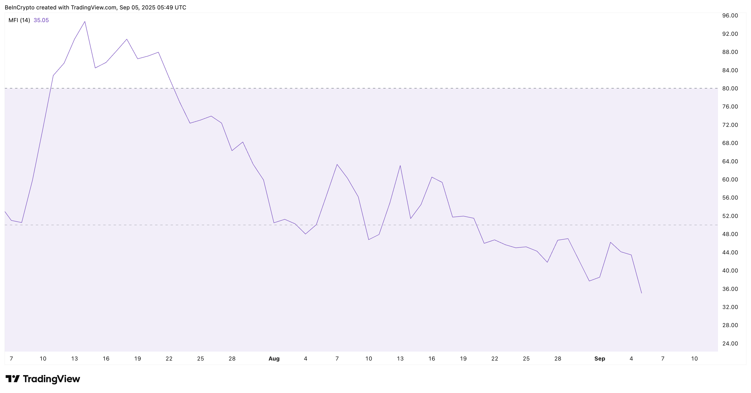 Genellikle, düşüş yönlü kesişimler boğalar yoğun alımlarla geri dönerse başarısız olabilir. Ancak burada bu pek olası görünmüyor. Hem işlem hacmini hem de fiyat hareketini ölçen Para Akışı Endeksi (MFI) 35’e düştü. Bu, daha az trader’ın düşüşü satın aldığını ve satış baskısının arttığını gösteriyor.