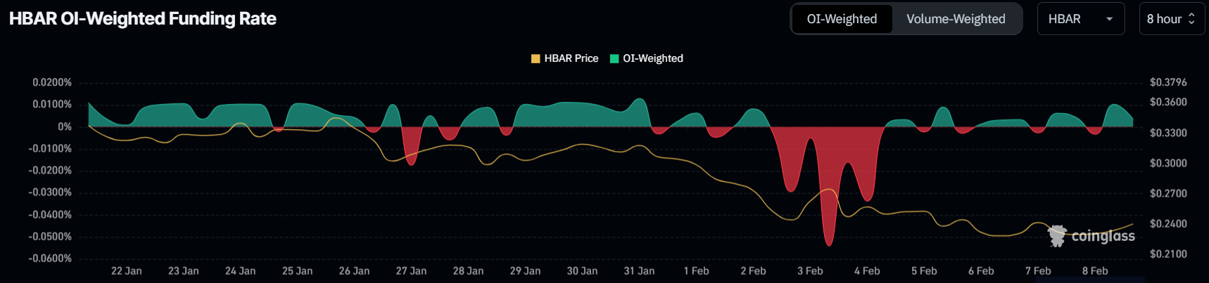 HBAR’ın fonlama oranı son birkaç gündür pozitif ve negatif arasında dalgalanıyor. Bu durum, trader’ların token’ın gelecekteki fiyat yönü hakkında belirsiz olduğunu gösteriyor. Sonuç olarak, birçok kişi yönlü bahisler yapmak yerine dalgalanmalardan yararlanmak için pozisyonlarını ayarlıyor.