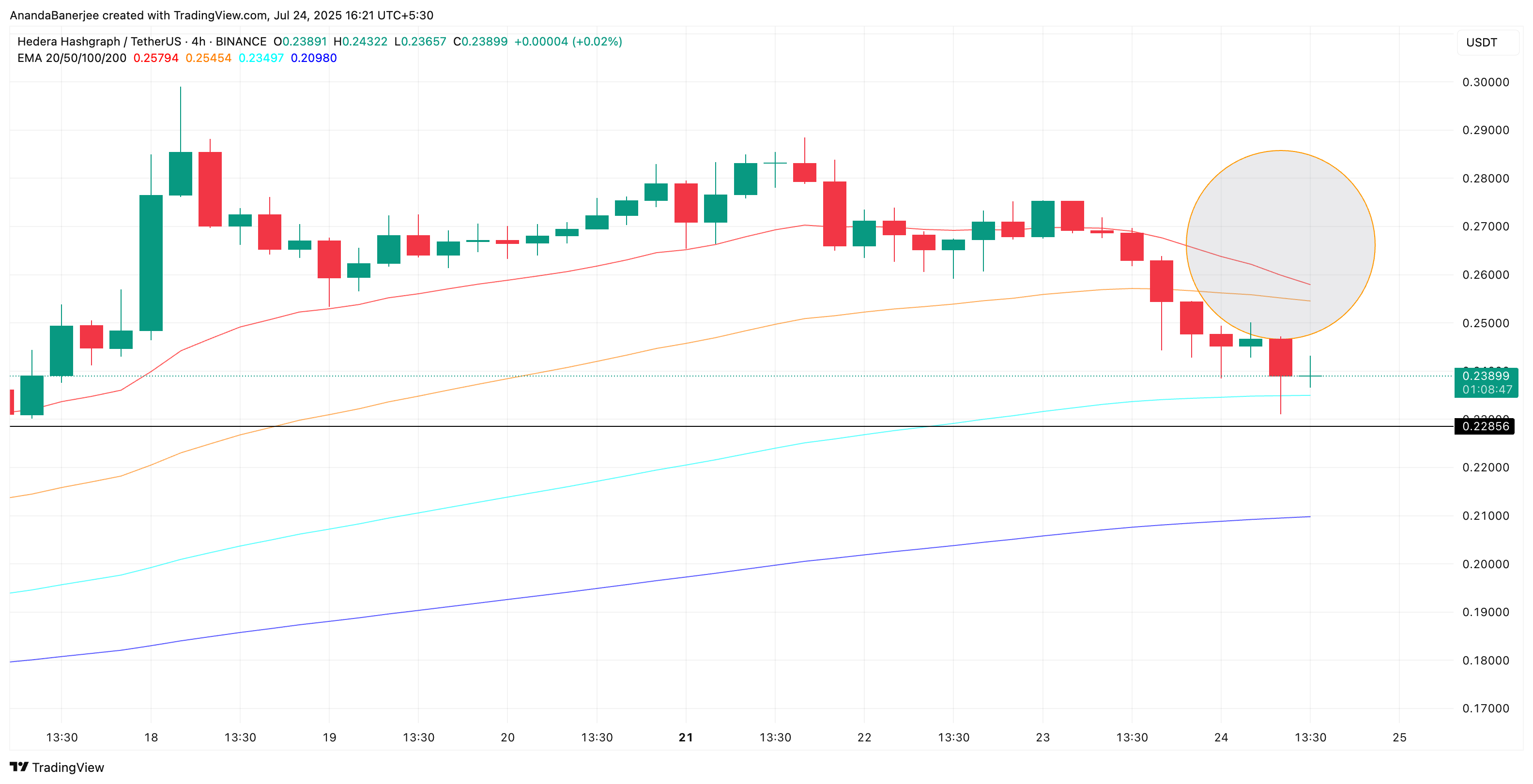 HBAR fiyatı şu anda $0,23 civarında işlem görüyor ve $0,23’teki 0,382 Fibonacci düzeltme seviyesinin hemen üzerinde duruyor. Bu çizgi, $0,12’lik son düşük seviyeden $0,29’luk yüksek seviyeye kadar çizildi.
