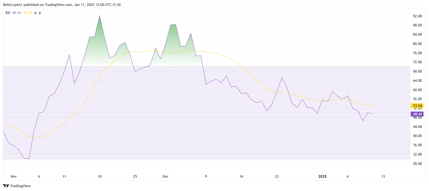 HBAR’ın genel ivmesi, artan bir düşüş trendini yansıtıyor. Önemli bir teknik gösterge olan Göreceli Güç Endeksi (RSI), son ayda istikrarlı bir şekilde düşüyor. Bu aşağı yönlü eğim, satış baskısının arttığını ve altcoin’in konumunu daha da zayıflattığını gösteriyor.
