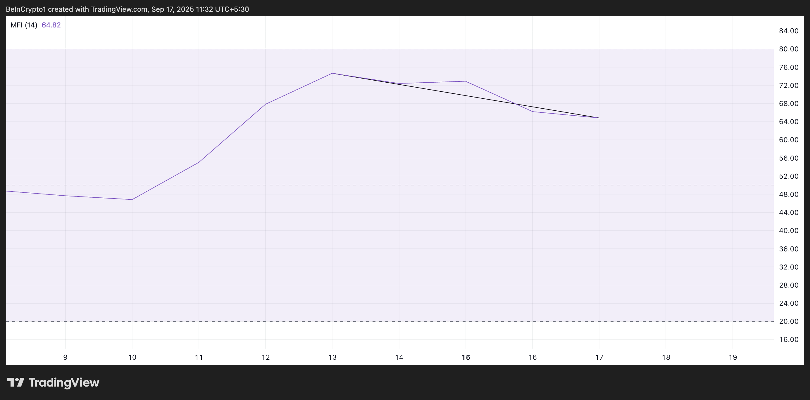 HBAR’ın fiyat düşüşü Pazar günü başladığından beri, Money Flow Index (MFI) de yavaşça düşüş eğiliminde, bu da piyasada token birikiminin yavaşladığını gösteriyor.