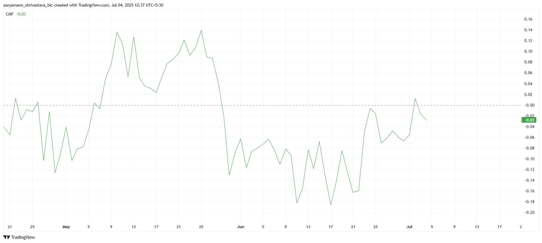 Chaikin Money Flow (CMF) göstergesi, sıfır çizgisinin üzerinde kapanmakta zorlanıyor ve bu da HBAR’a olan girişlerin zayıf olduğunu gösteriyor. Bu endişe verici bir sinyal, çünkü CMF’nin pozitif hareketi sürdürememesi yatırımcı şüpheciliğini ve güçlü alım ilgisinin eksikliğini yansıtıyor. HBAR, bir aydan uzun bir süre sonra ilk kez pozitif CMF bölgesine kısa bir süreliğine geçse de genel piyasa hissiyatı zayıf kalıyor.
