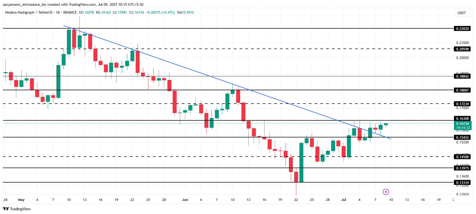 Şu anda 0,161 Dolar fiyatla, HBAR 0,163 Dolar’lık önemli direnç seviyesinin hemen altında konumlanmış durumda. Bu dirence rağmen, HBAR iki aylık düşüş trendinden kurtularak toparlanma çabalarını engelleyen daha büyük bir engeli aşmayı başardı.