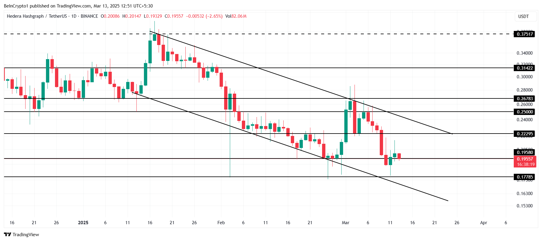 Devam eden piyasa koşulları göz önüne alındığında, HBAR 0,195 Dolar desteğini kaybetmeye karşı savunmasız. Bu gerçekleşirse, fiyat 0,177 Dolar’a düşebilir, bu da HBAR için son haftalarda kritik bir destek seviyesi olmuştur. Fiyat bu seviyenin altına düşerse, düşüş trendinin devam ettiğini ve modelin kırıldığını gösterir, bu da daha fazla fiyat düşüşüne yol açar.