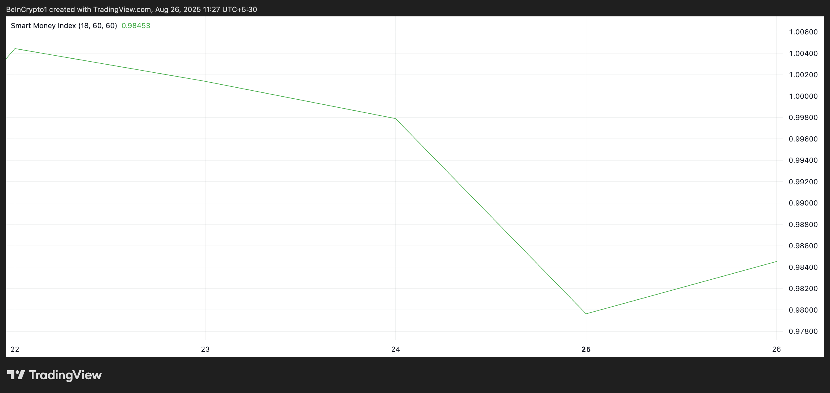 Ayrıca, kilit trader’lardan gelen alım baskısı durdu ve bu da HBAR üzerindeki aşağı yönlü baskıyı artırıyor. Token’ın Akıllı Para Endeksi (SMI), bu yazı itibarıyla 0,98 seviyesinde ve 22 Ağustos’tan bu yana yavaşça düşüyor, bu da ivmenin ayılar lehine değiştiğini doğruluyor.