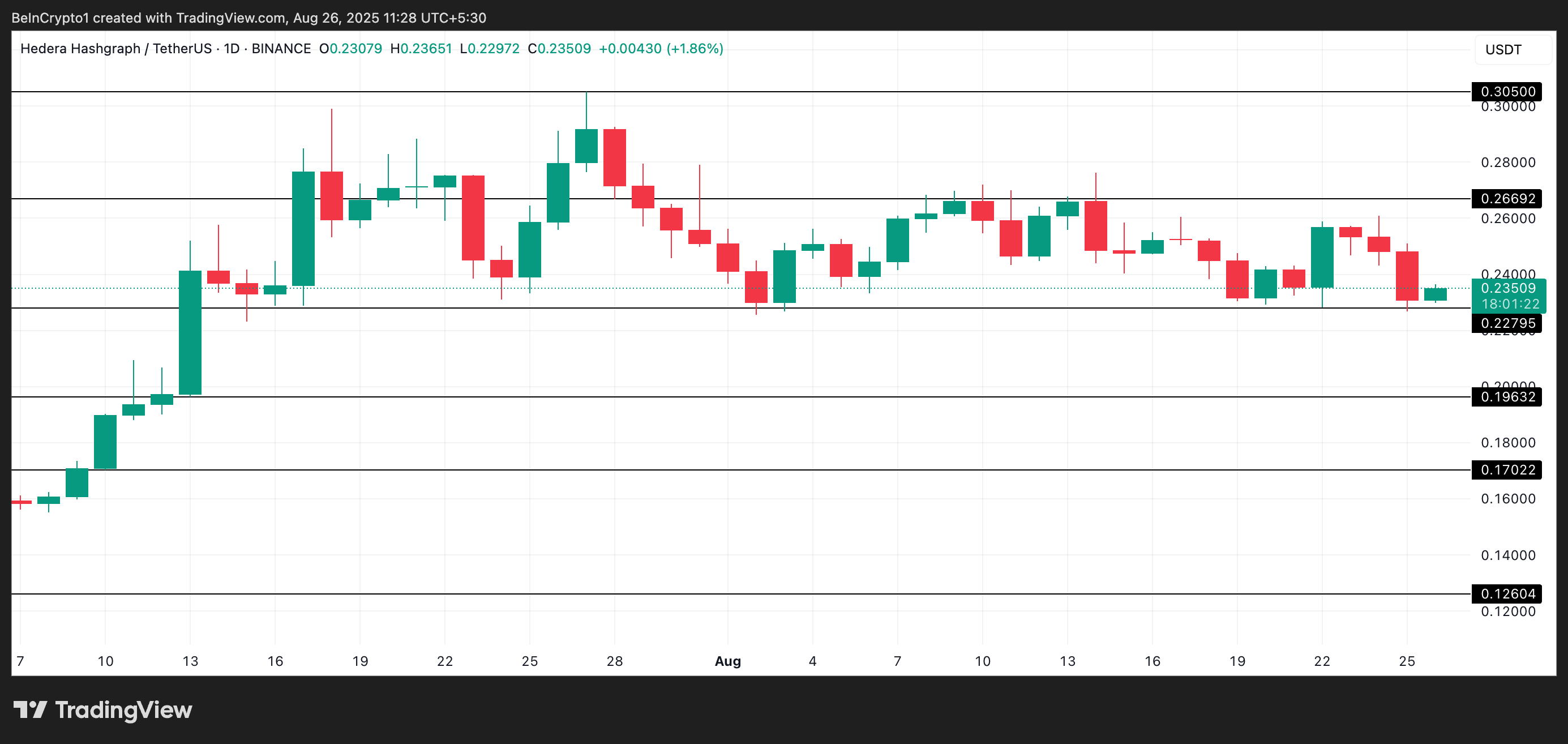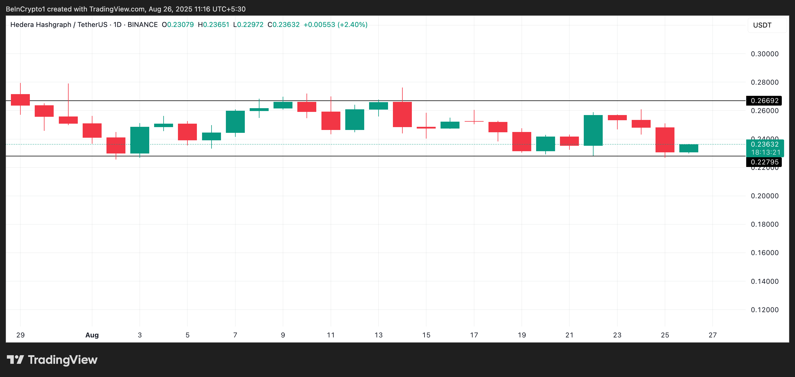 HBAR/USD bir günlük grafiğinden alınan veriler, altcoin’in yatay bir kanal içinde işlem gördüğünü gösteriyor. Temmuz ayındaki yükseliş, HBAR’ı 27 Temmuz’da 0,30 Dolar’lık bir döngü zirvesine taşıdıktan sonra, token yukarı yönlü ivmesini kaybetti ve fiyat durgunluğuna girdi.