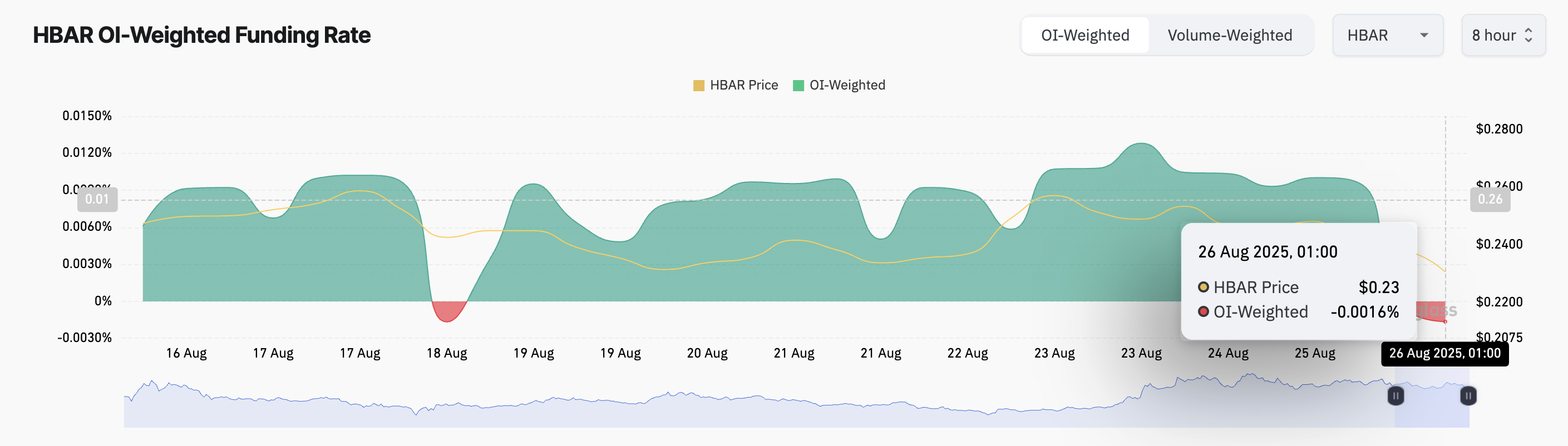 HBAR’ın ağırlıklı fonlama oranı, geçen hafta ilk kez negatife döndü ve bu durum kısa pozisyonların ivme kazandığını ve satış baskısının arttığını gösteriyor. Bu yazı itibarıyla, -%0,0016 seviyesinde bulunuyor.