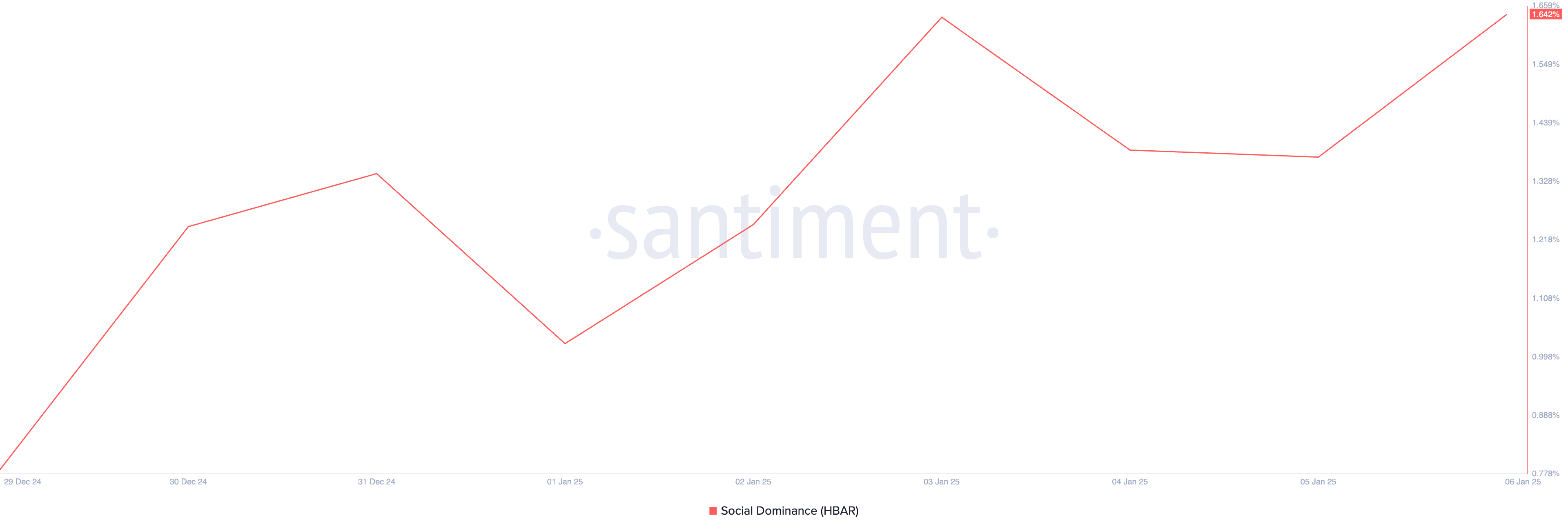 SponsoredBasın zamanında, HBAR’ın sosyal hakimiyeti %1,64, 1 Ocak’tan bu yana %39 arttı. Bir varlığın sosyal hakimiyeti arttığında, o varlık etrafındaki sosyal medya aktivitesinde önemli bir artış olduğu anlamına gelir.