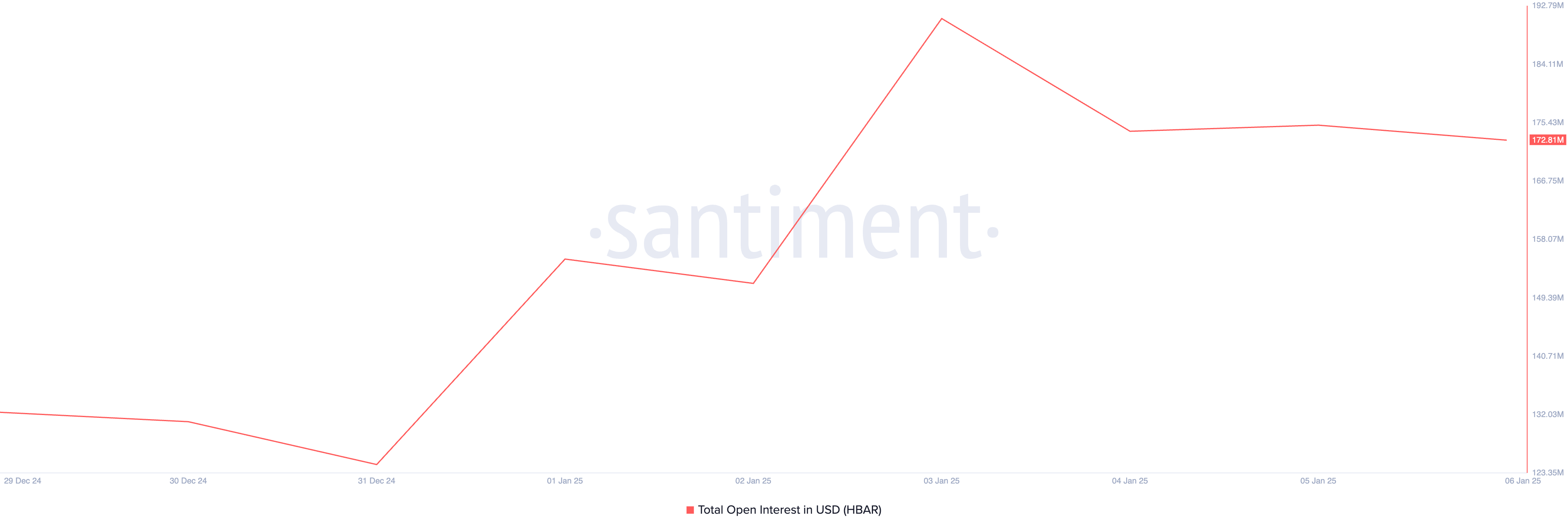 İnceleme döneminde HBAR’ın açık pozisyonlarındaki artış, bu trading aktivitesindeki yükselişi doğruluyor. Basın zamanında, 173 milyon Dolar, son beş günde %38 arttı.