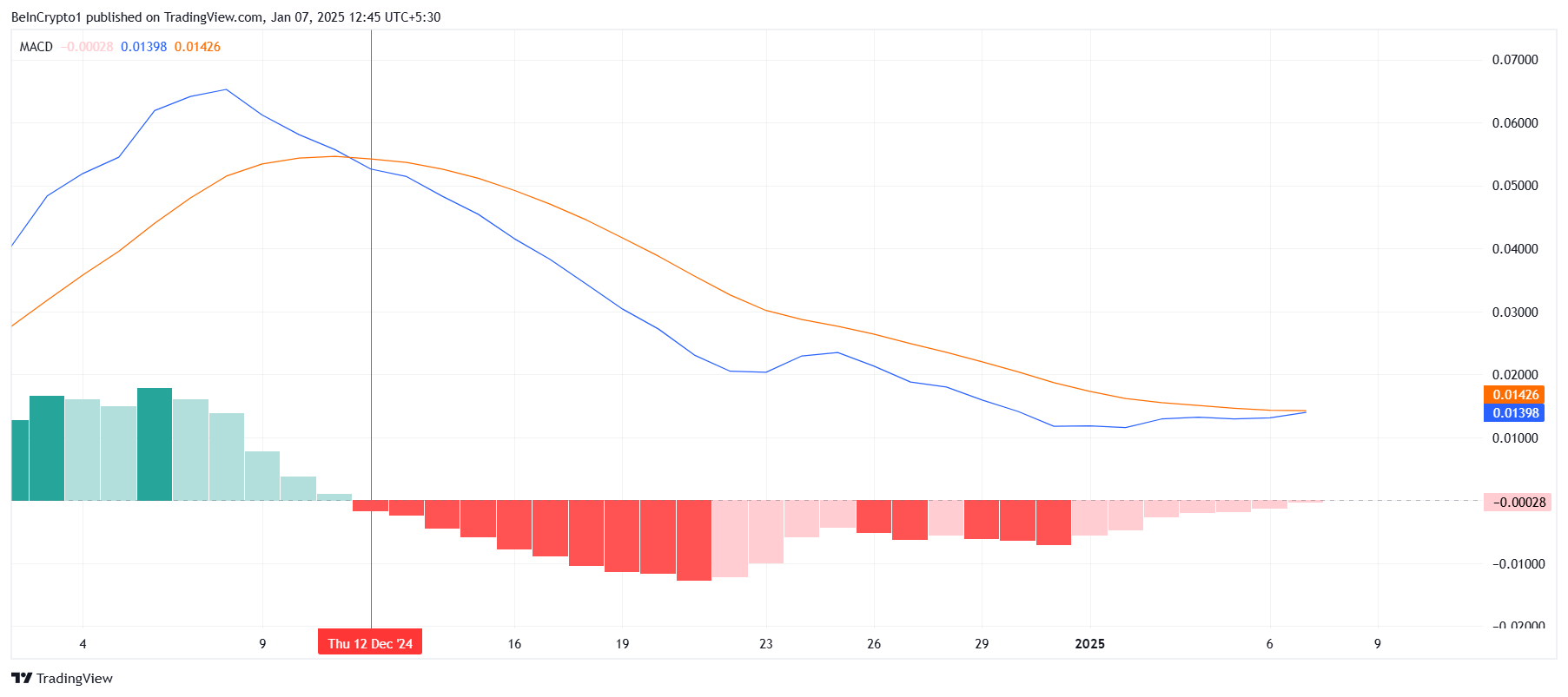 HBAR’ın makro momentumu iyileşme belirtileri gösteriyor, çünkü Hareketli Ortalama Yakınsama Iraksama (MACD) göstergesi düşüş baskısının sona erdiğini öne sürüyor. MACD hattı, sinyal hattı ile bir kesişime yaklaşıyor ve potansiyel bir yükseliş çıkışını işaret ediyor. Böyle bir değişim, daha geniş piyasa ipuçlarının iyileşmesiyle desteklenen yukarı yönlü momentumun başlangıcını işaretleyecektir.