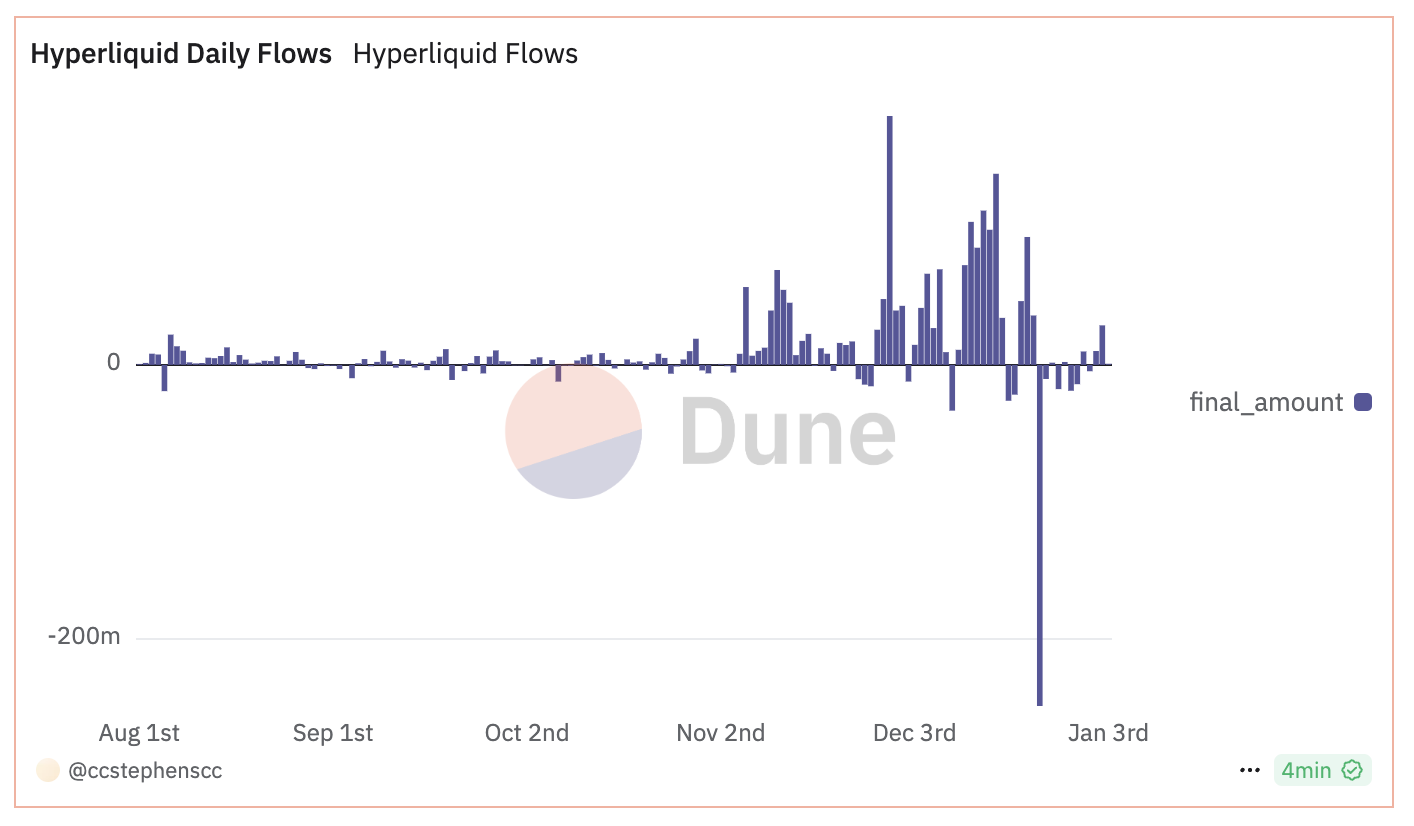 Ancak, 23 Aralık’ta Hyperliquid, -243 milyon dolarlık keskin bir çıkış kaydederek negatif bir dönüm noktası yaşadı. O zamandan beri, akışlar -18 milyon dolar ile 28 milyon dolar arasında dalgalanarak dengelendi. Bu dengeleme, önemli çıkışların ardından piyasa hissiyatının dengelendiğini ve ne güçlü bir birikim ne de yoğun bir satış baskısının hakim olduğunu gösteriyor.