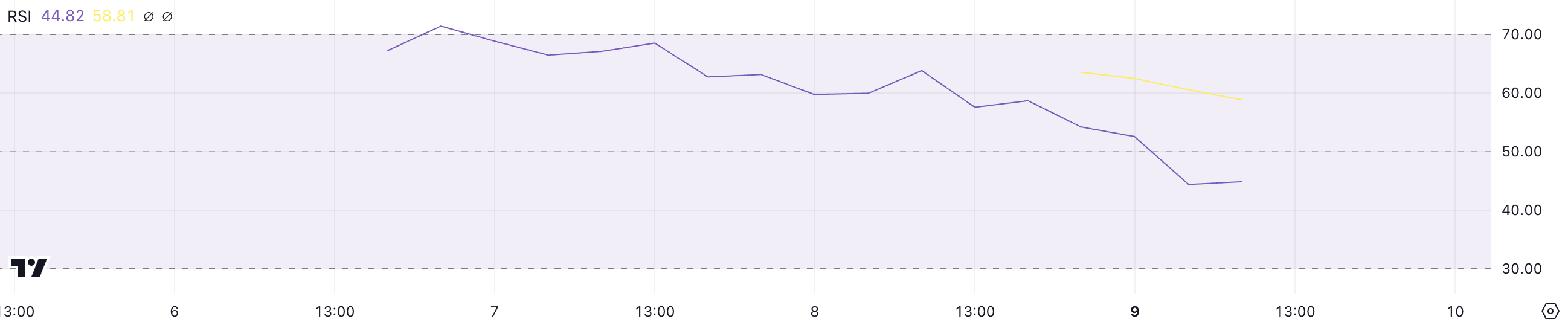 Ancak, bu momentum uzun sürmedi ve RSI düşmeye başladı. Şu anda 44,8 seviyesinde, bu da nötr veya hafif düşüş eğilimi olduğunu gösteriyor.