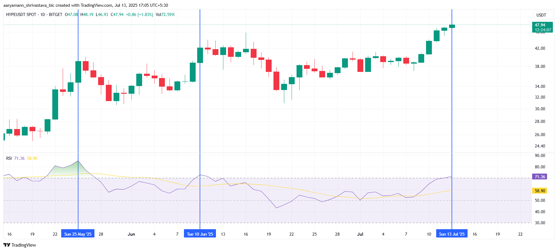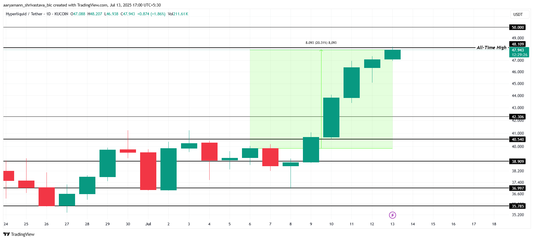 HYPE’nin fiyatı şu anda 47,94 Dolar seviyesinde işlem görüyor ve son yedi gün içinde %20 arttı. Altcoin, bu hafta boğa modelini genişleterek 48,10 Dolar ile yeni bir ATH oluşturdu.