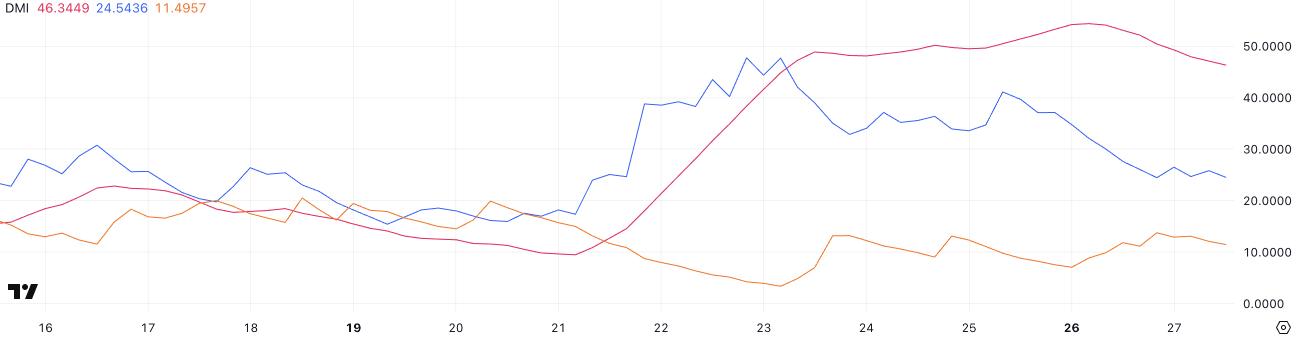 Hyperliquid için Yönlü Hareket Endeksi (DMI), trend gücünü ölçmek için kullanılan ADX’in şu anda 46,34 olduğunu gösteriyor. Bu, altı gün önceki 9,49’dan önemli bir artış, ancak dünün 54,39’undan biraz düşük.
