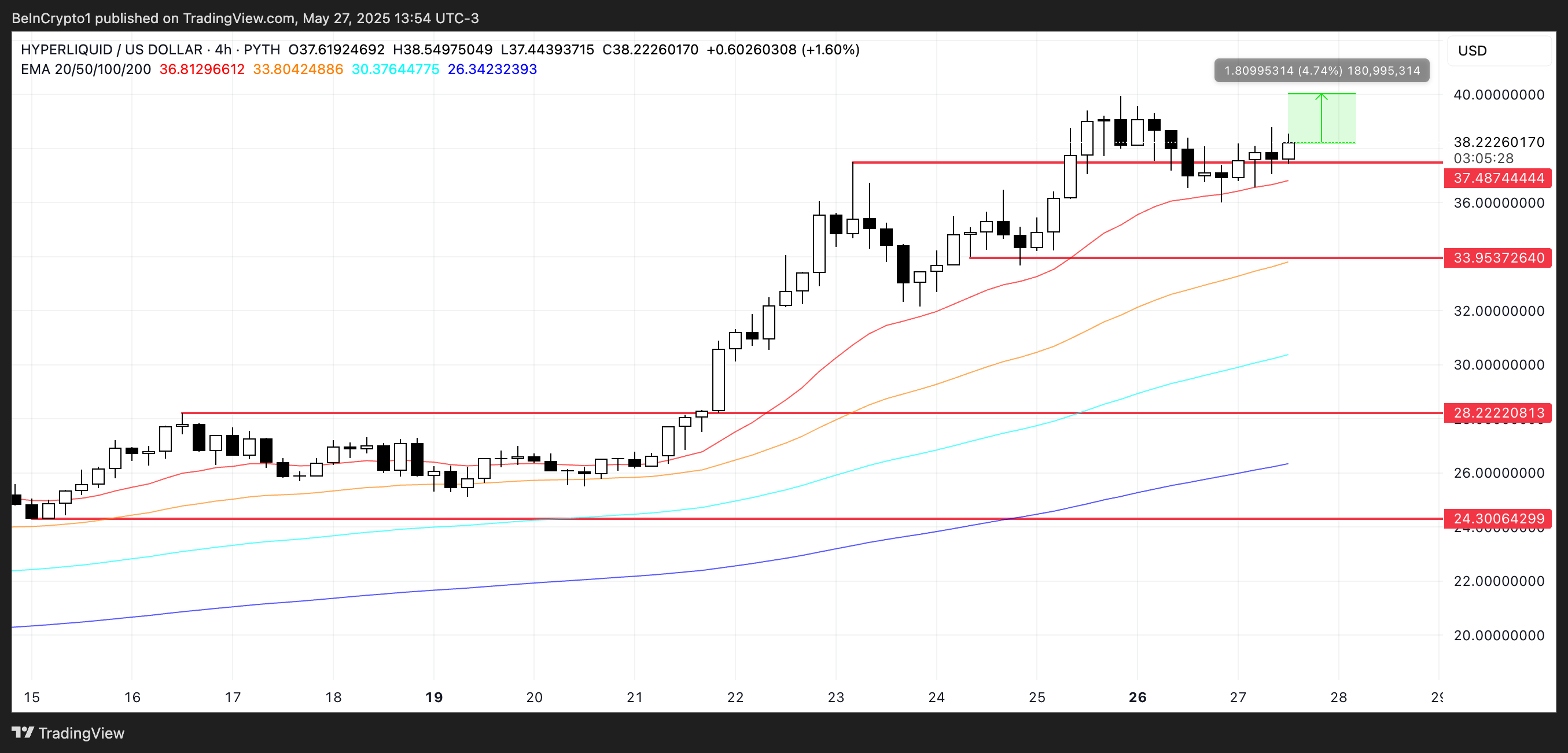 Hyperliquid fiyatı şu anda 40 Dolar seviyesinin sadece %4,7 altında işlem görüyor—bu, daha önce hiç ulaşmadığı bir fiyat seviyesi.