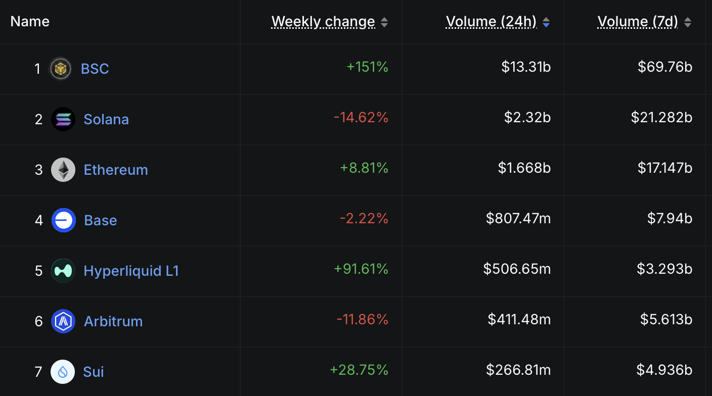 Hyperliquid (HYPE), kripto para trading dünyasında en baskın oyunculardan biri olmaya devam ediyor. Son 24 saatte DEX hacmiyle 5. en büyük zincir olarak sıralanıyor, 506 milyon Dolar’a ulaştı ve geçen hafta %91 artış göstererek Arbitrum ve Sui’yi geride bıraktı.