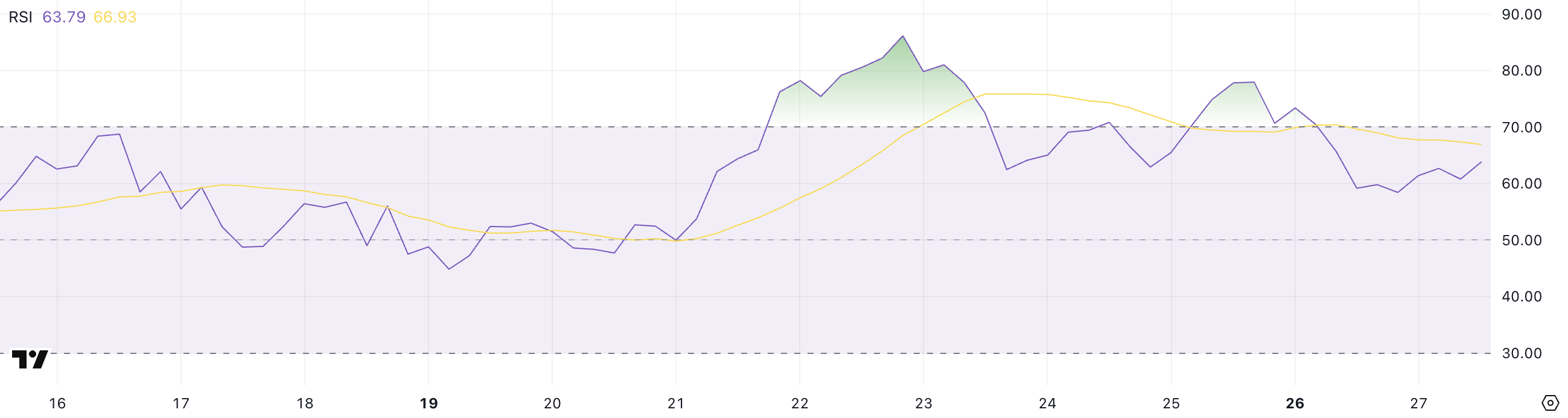 RSI, fiyat değişikliklerinin hızını ve büyüklüğünü ölçen bir momentum göstergesidir ve 0 ile 100 arasında değişir. 70’in üzerindeki okumalar genellikle aşırı alım koşullarını, 30’un altındaki okumalar ise varlığın aşırı satılmış olabileceğini gösterir.